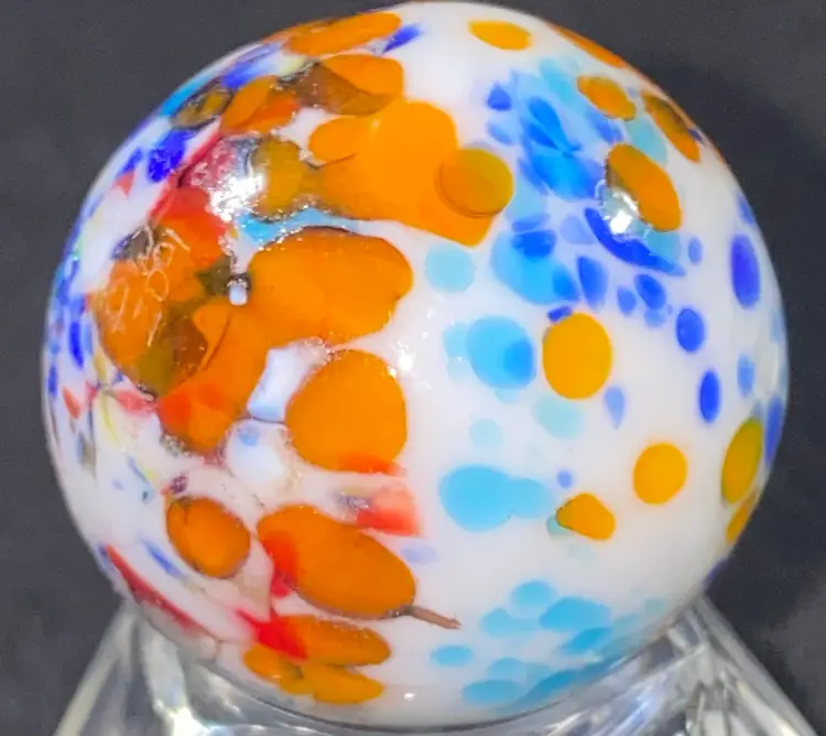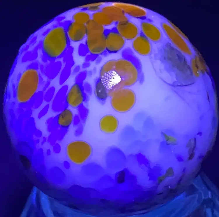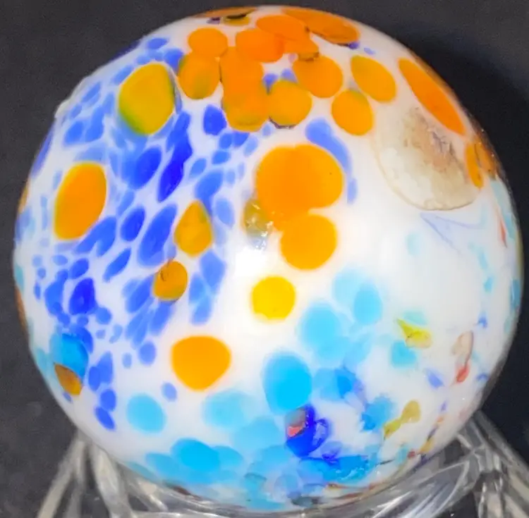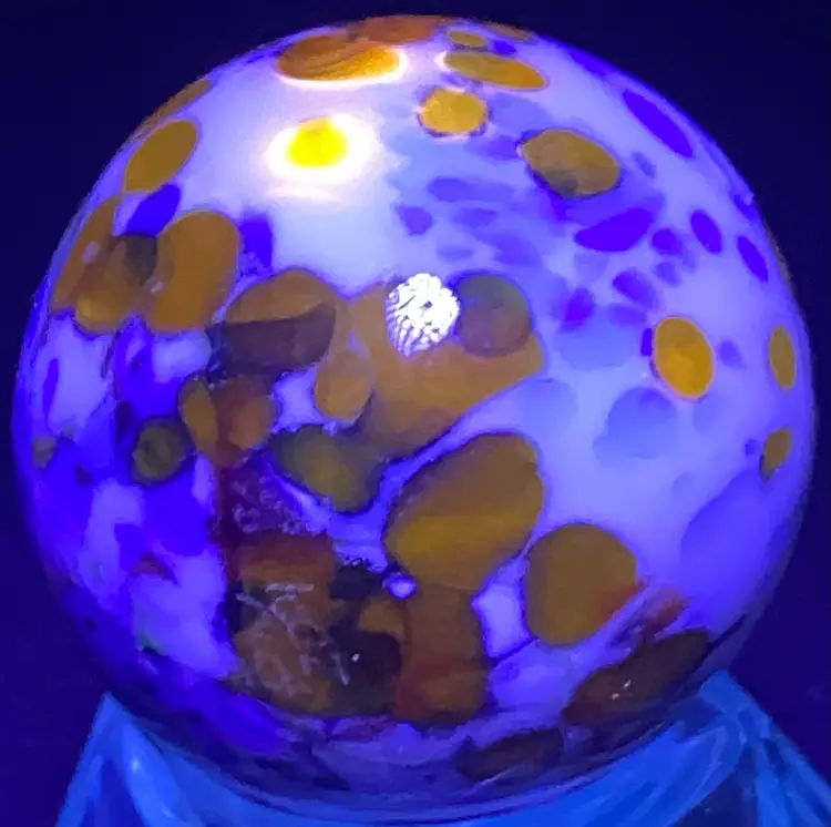 SALE- 25% Off 1 1/8" Signed orange blue white speckled Marble UV Glow Front And Back Photos (was $28)