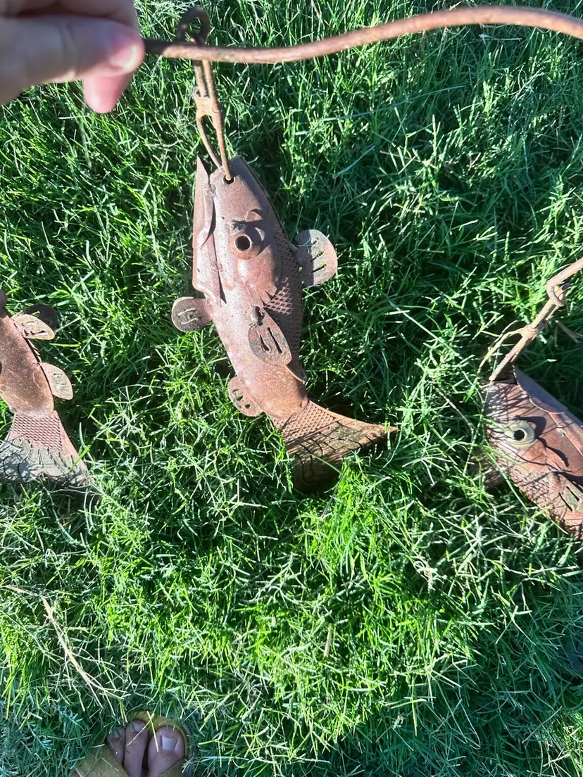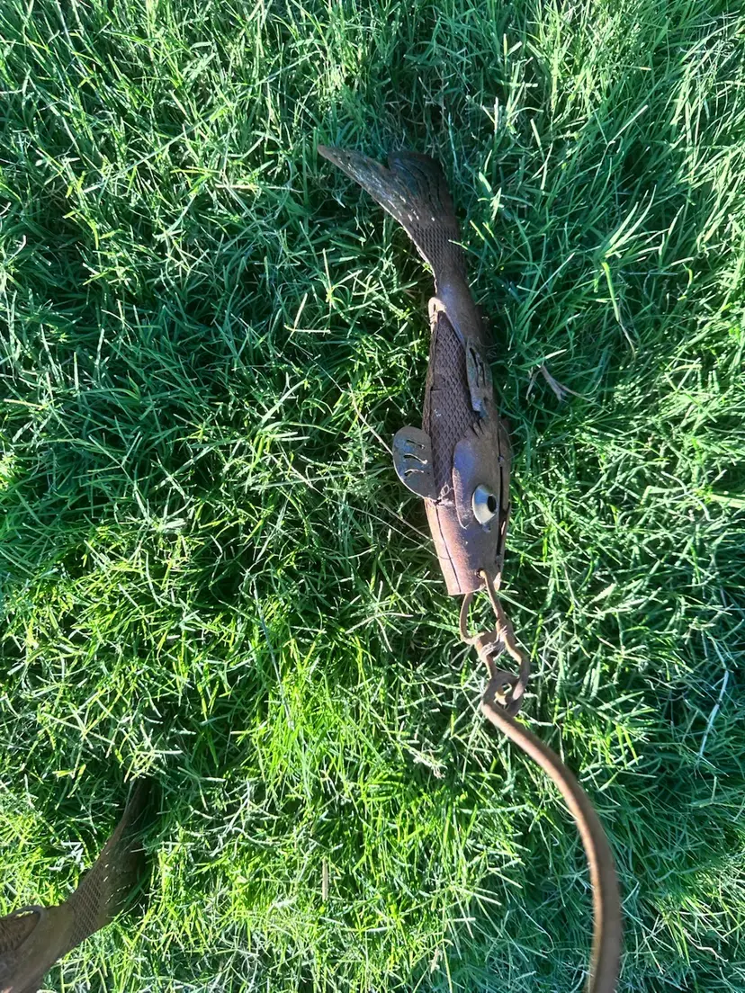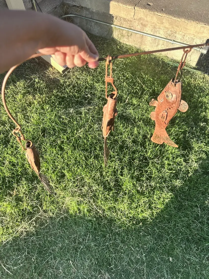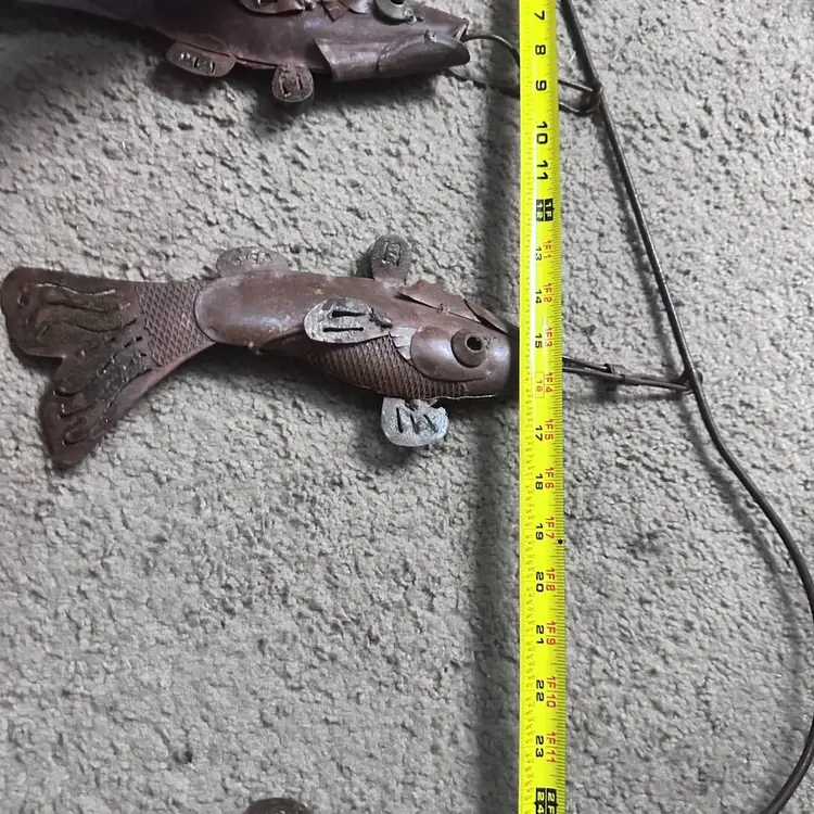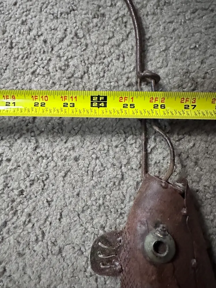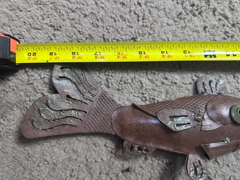 It is metal I like it’s a perfect gift for a fisherman or a hunter measures 27” And 21” it is rusty it does come as is