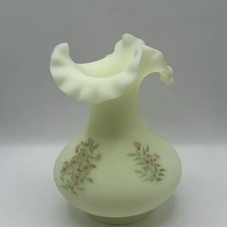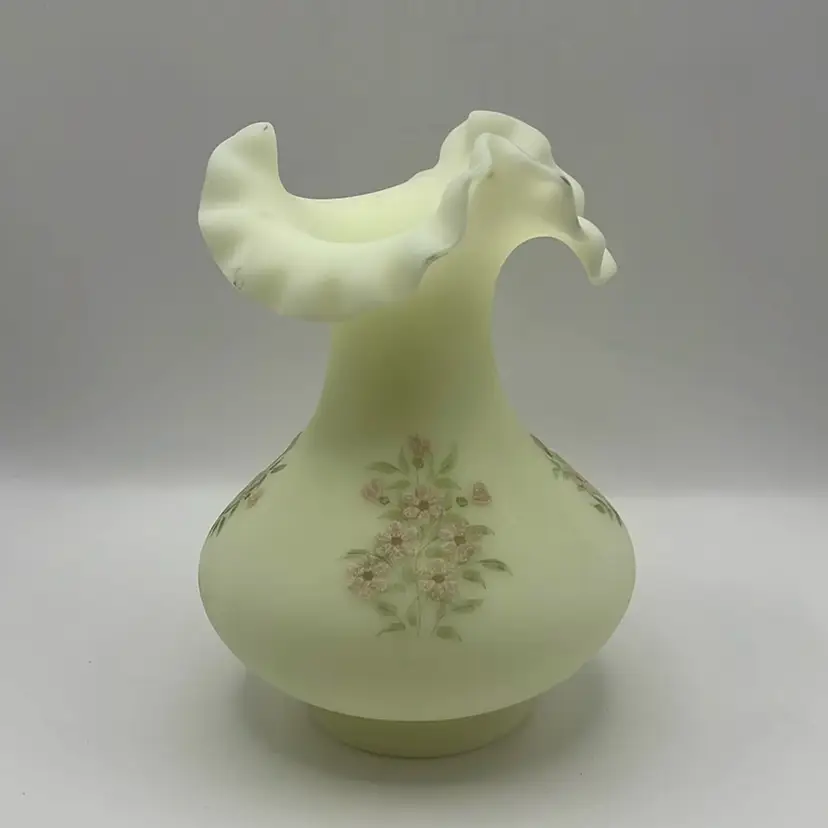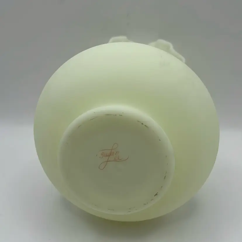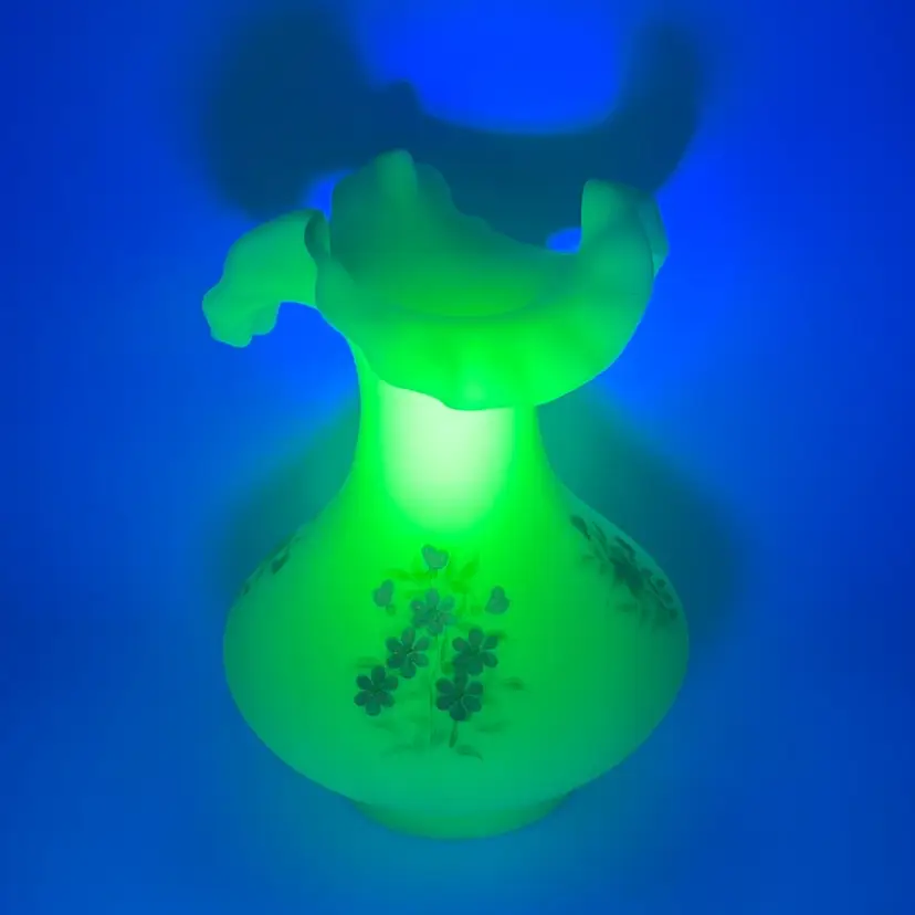 Signed by Susan Lee and features a ruffled rim. The vase glows under UV light and is in very good condition!