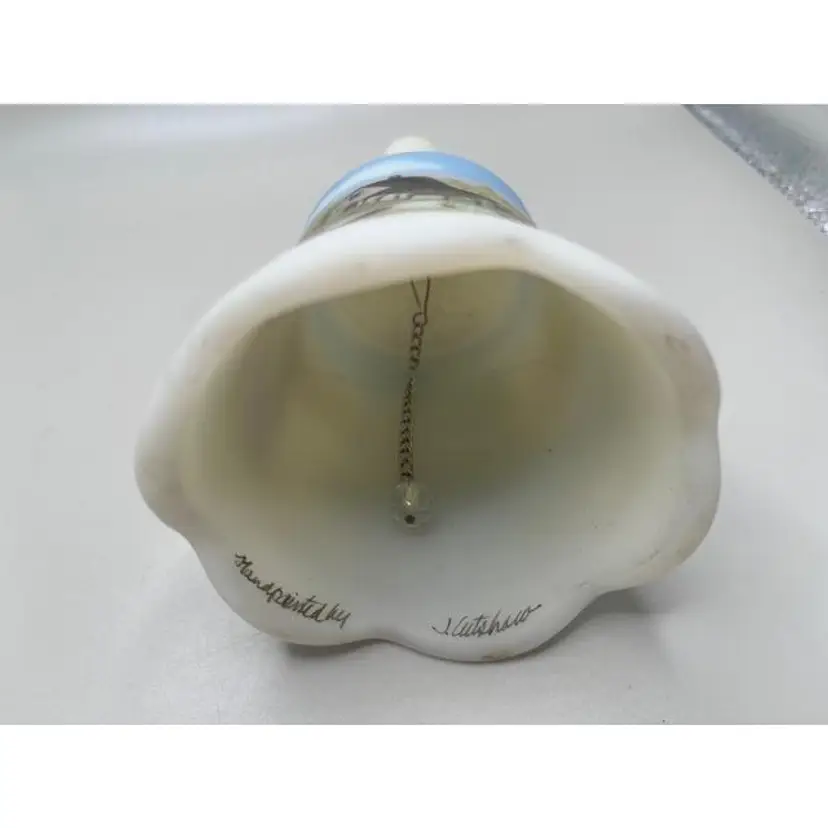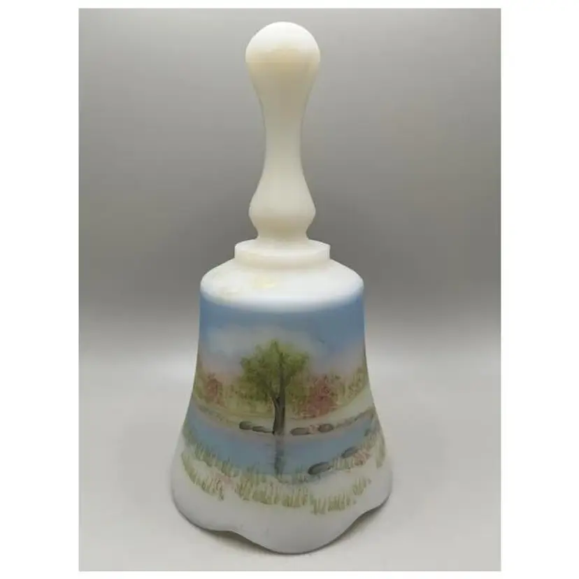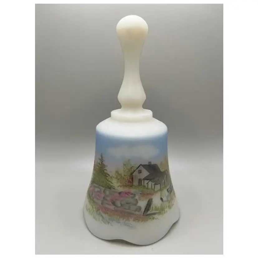 This beautiful vintage Fenton bell features a beautifully hand-painted cottage scene, perfect for adding a touch of nostalgia to your decor. The delicate artwork and classic design make it a lovely addition to any collection or a thoughtful gift.