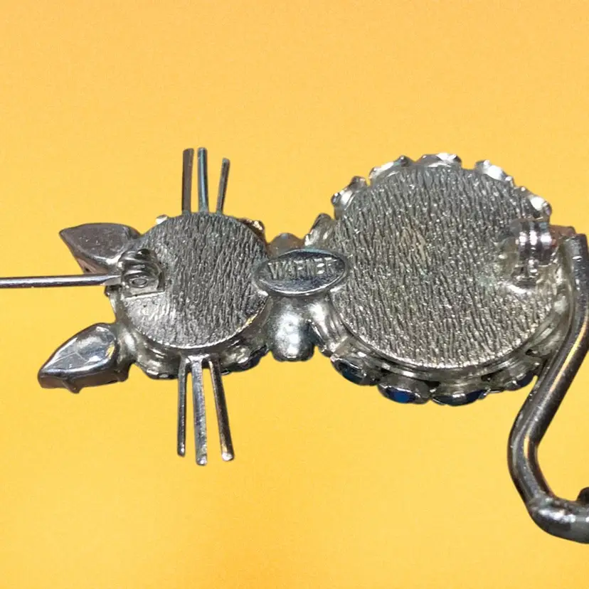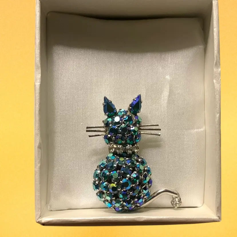 08. WARNER Blue Kitty CAT Brooch Aurora Borealis Rhinestones Pin Signed Vintage