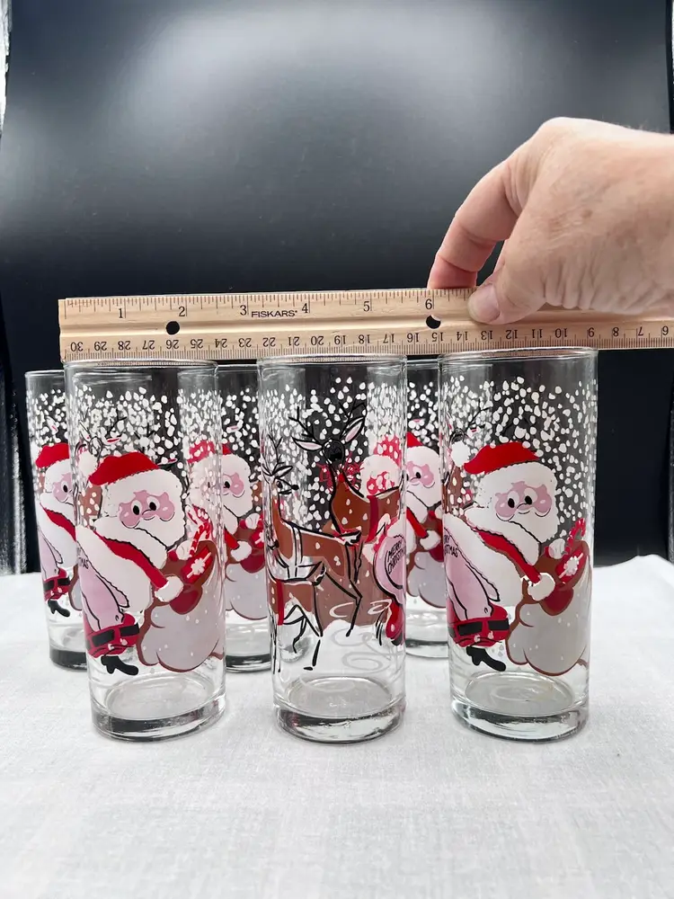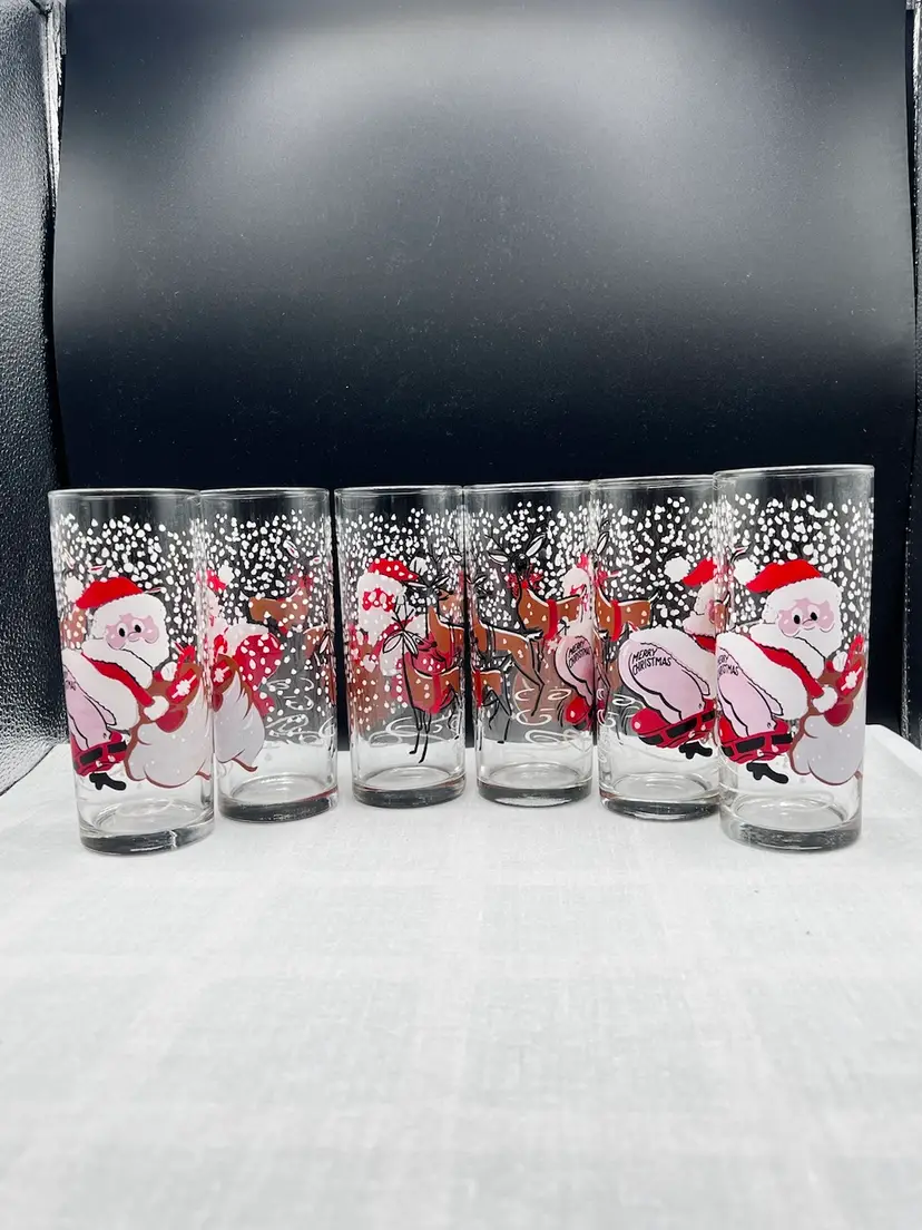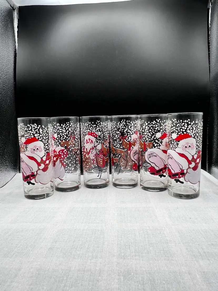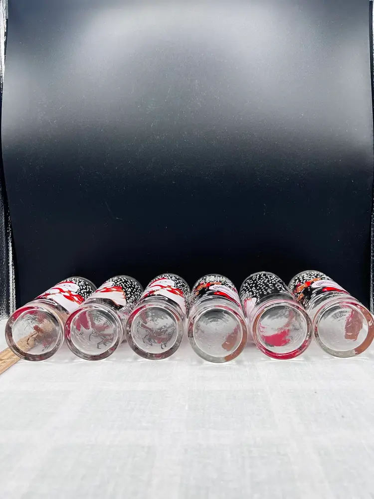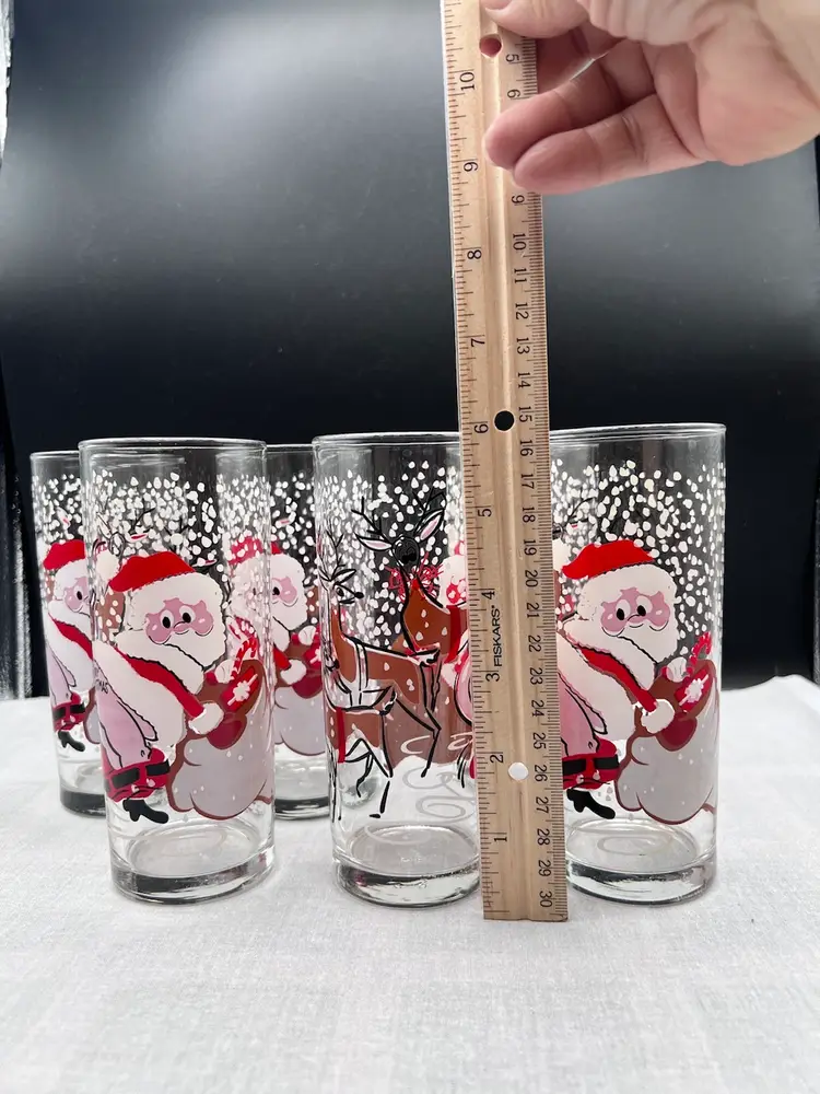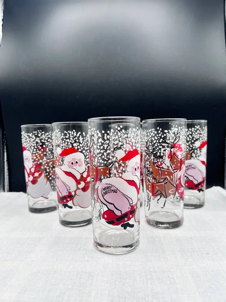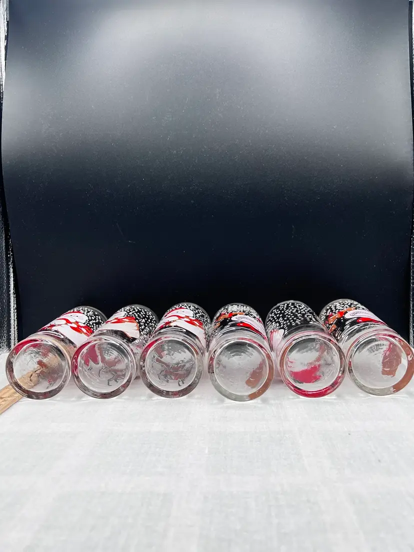 Unique and set of 6 MCM Collins/highball glasses Who knew Santa would sport a tattoo?!? Each glass stands 6" tall and is 2 1/2" wide Glasses are all in very good vintage used condition, no chips, cracks or crazing All of the design colors are intact and bright