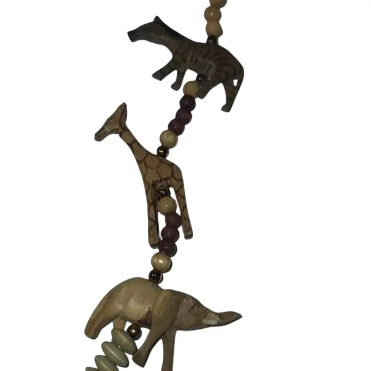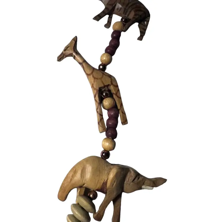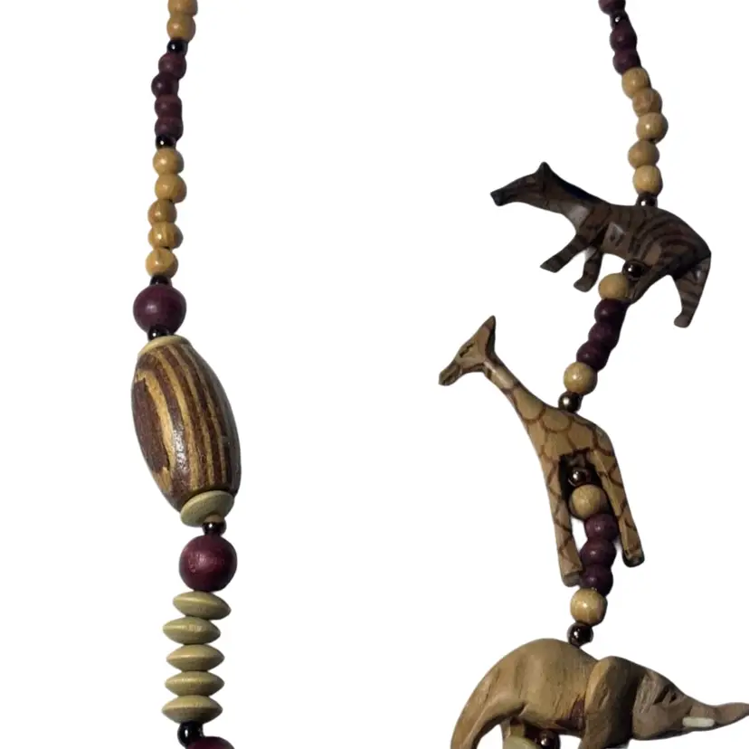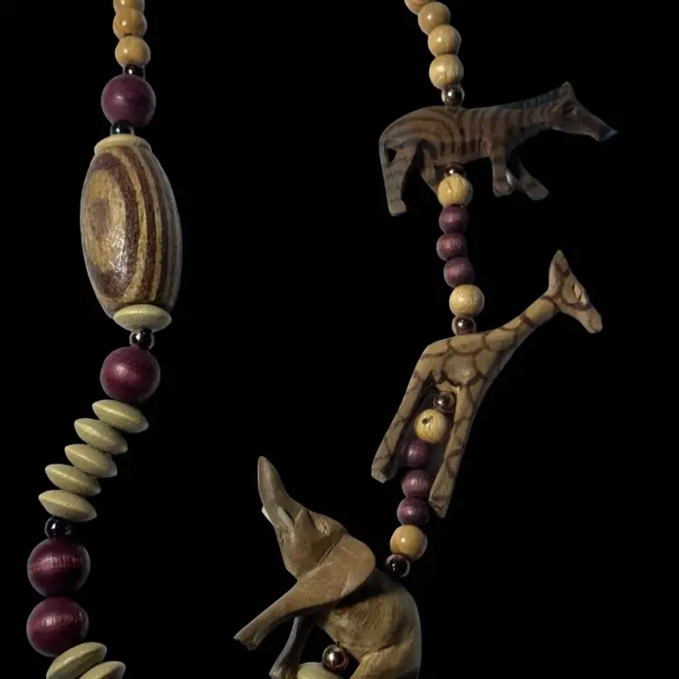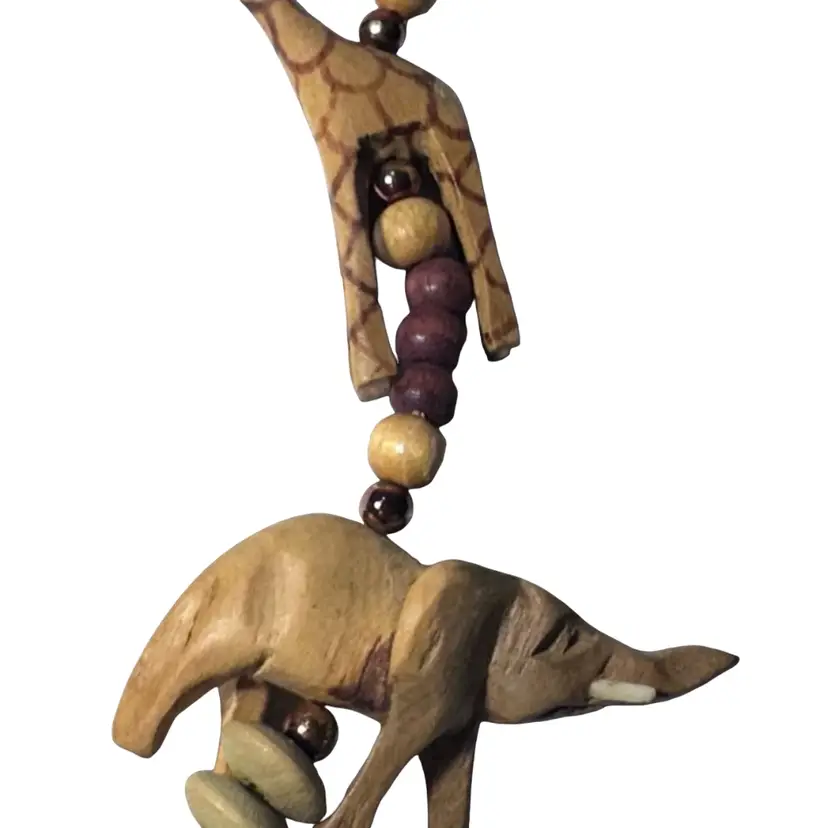 this African Teak Hand-carved Safari Animals Necklace This necklace is such an amazing find, is in mint great, one mark on the big wooden bead and comes from Western Africa. Made from Teak Wood, this African Teak Hand-carved Safari Animals Necklace has hand-carved animals including a Zebra, Giraffe, and an Elephant, showcasing the beauty of the nature and animals found in the African wilderness. Each piece is a hand-carved piece made from Teak Wood. Along the necklace, stunningly hand-beaded pieces of varying shapes of Teak Wood radiate from this masterpiece. The necklace is in pristine condition For it age.