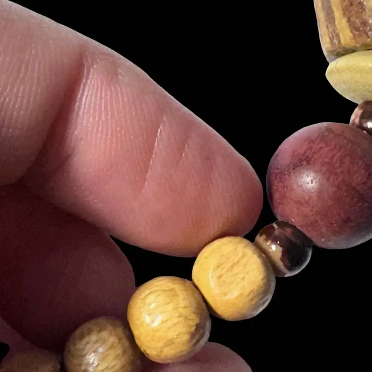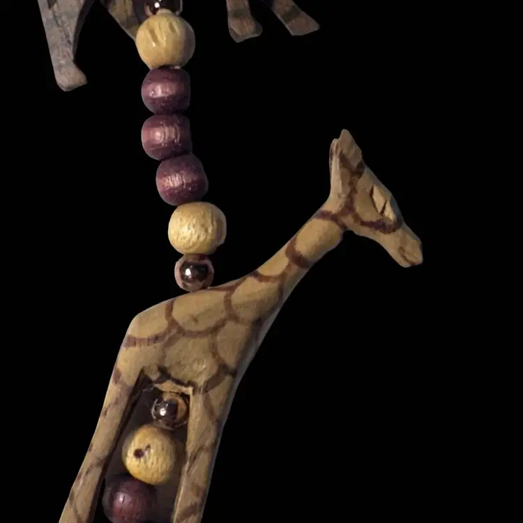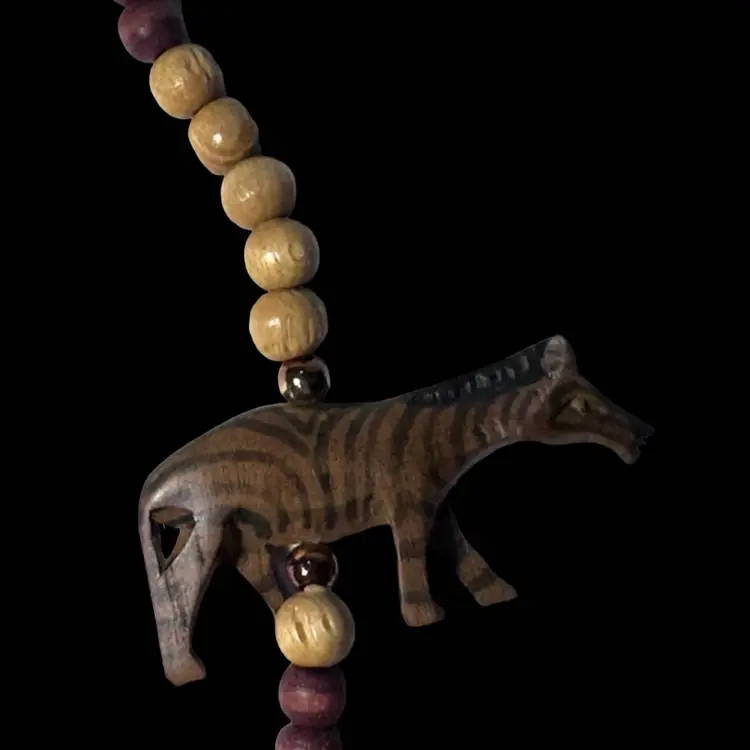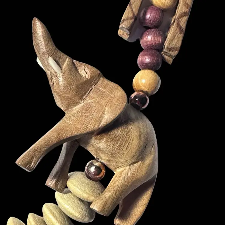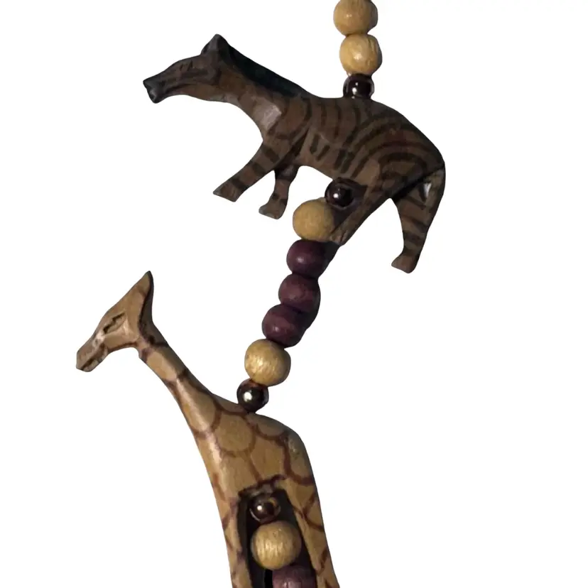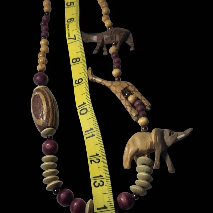 this African Teak Hand-carved Safari Animals Necklace This necklace is such an amazing find, is in mint great, one mark on the big wooden bead and comes from Western Africa. Made from Teak Wood, this African Teak Hand-carved Safari Animals Necklace has hand-carved animals including a Zebra, Giraffe, and an Elephant, showcasing the beauty of the nature and animals found in the African wilderness. Each piece is a hand-carved piece made from Teak Wood. Along the necklace, stunningly hand-beaded pieces of varying shapes of Teak Wood radiate from this masterpiece. The necklace is in pristine condition For it age.