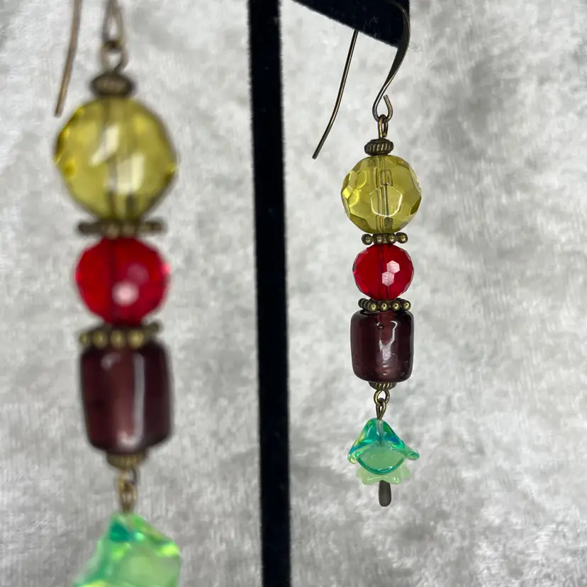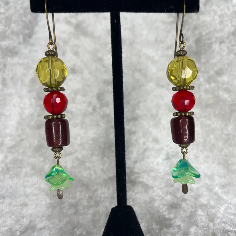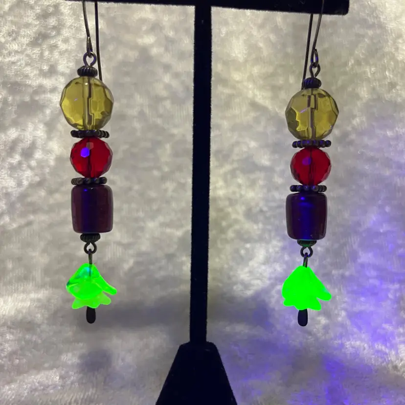 • Materials: upcycled vintage glass beads and Czech uranium beads.