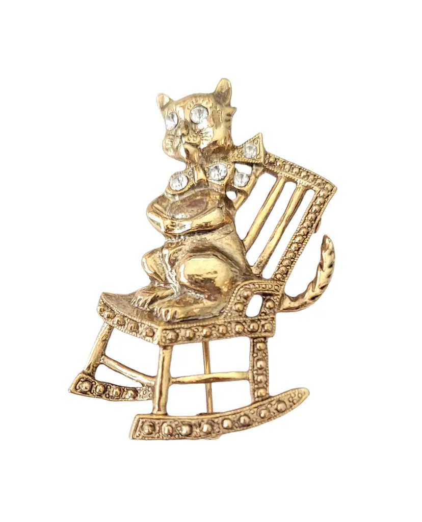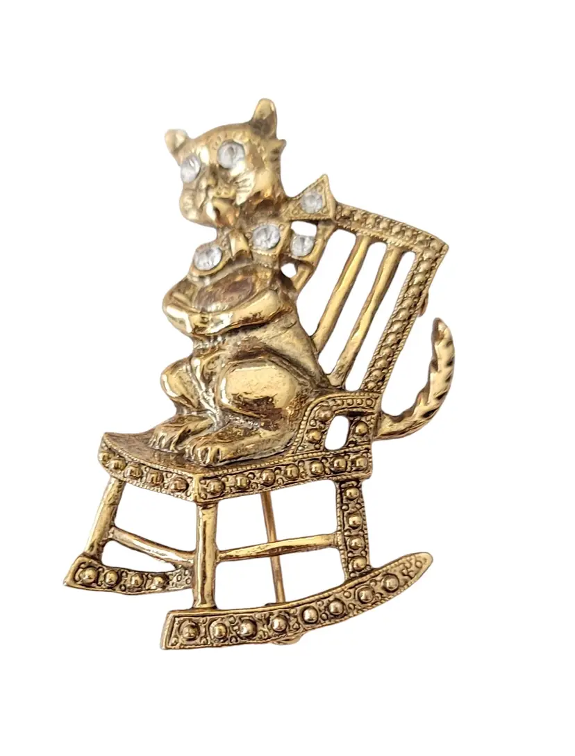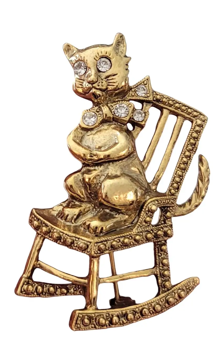 1928 Brand Jewelry has created fashionable reproductions of the most beautiful, and exquisite vintage jewelry. This pin features a mischievous cat on a rocking chair in a radiant gold tone base. The cat is adorned with clear faceted rhinestones on its collar and both eyes. It measures approximately 1.1 inches in width and 1.9 inches in length. It has textured swirl pattern markings at the back noticeable on unsigned 1928 Jewelry Co. items. Finished with a secure locking pin that functions properly, ensuring it stays securely in place and allowing this piece to be easily attached to clothing or accessories.