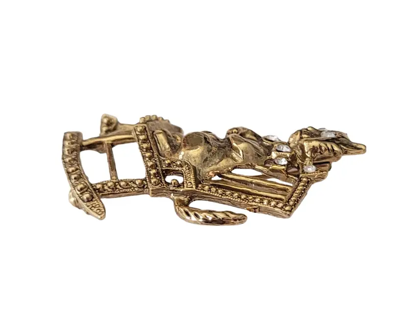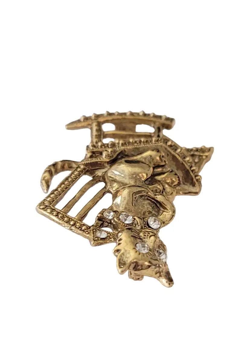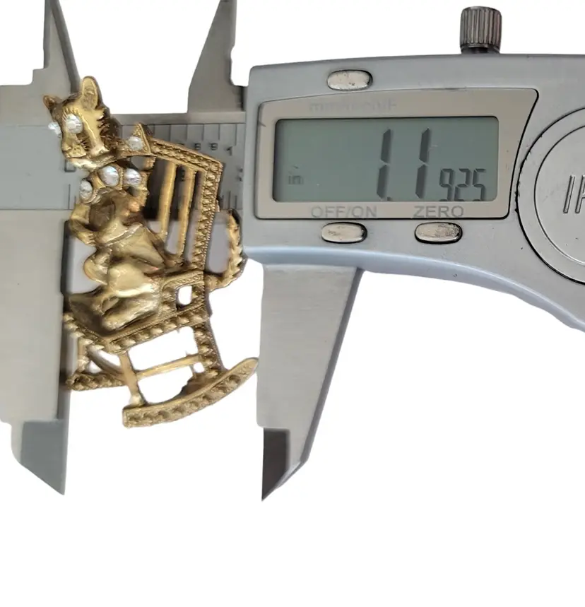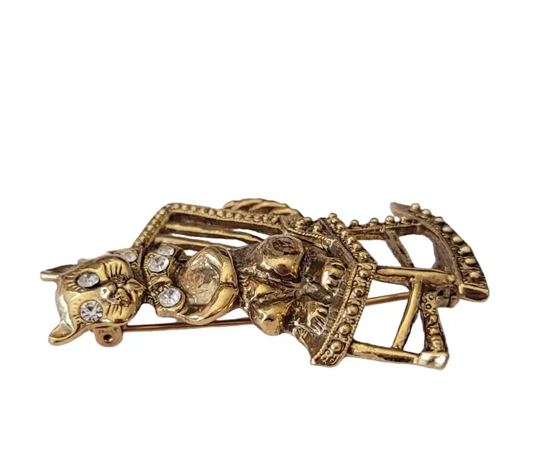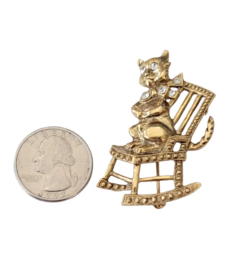 1928 Brand Jewelry has created fashionable reproductions of the most beautiful, and exquisite vintage jewelry. This pin features a mischievous cat on a rocking chair in a radiant gold tone base. The cat is adorned with clear faceted rhinestones on its collar and both eyes. It measures approximately 1.1 inches in width and 1.9 inches in length. It has textured swirl pattern markings at the back noticeable on unsigned 1928 Jewelry Co. items. Finished with a secure locking pin that functions properly, ensuring it stays securely in place and allowing this piece to be easily attached to clothing or accessories.