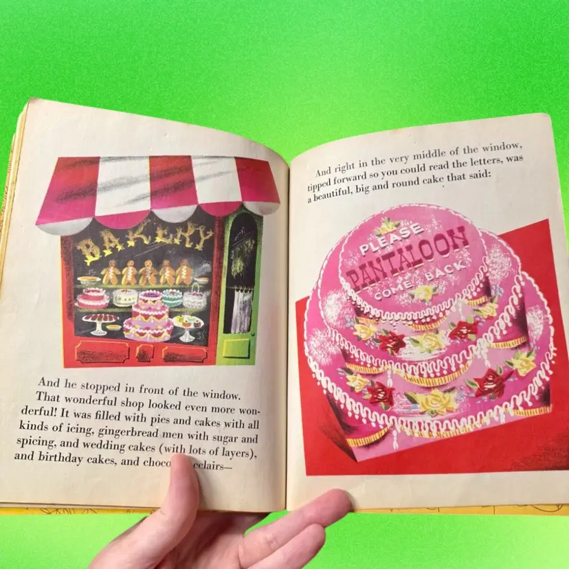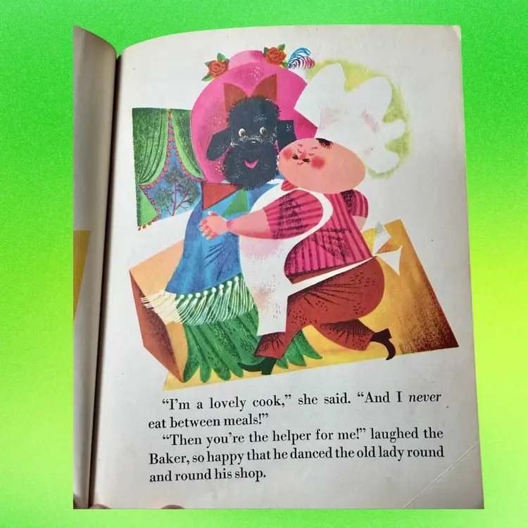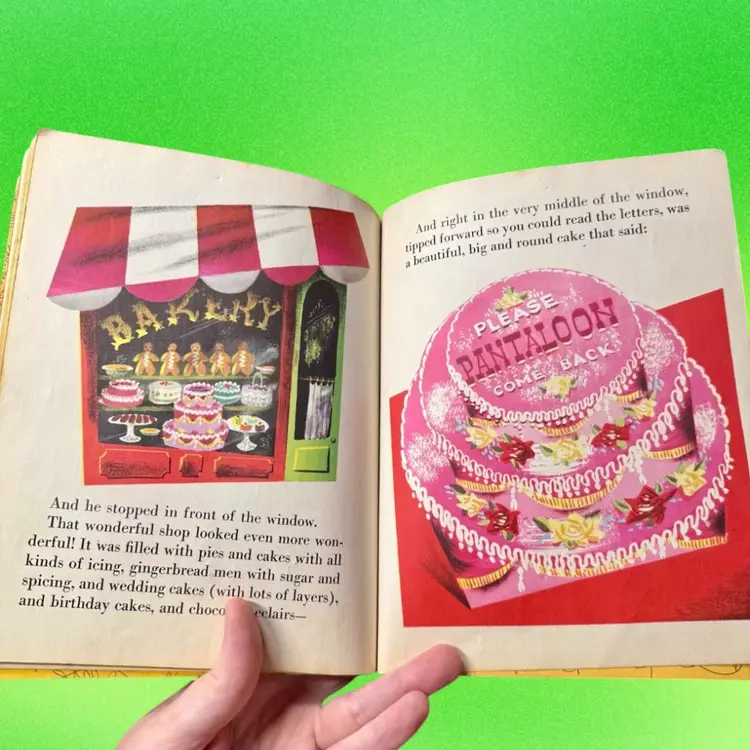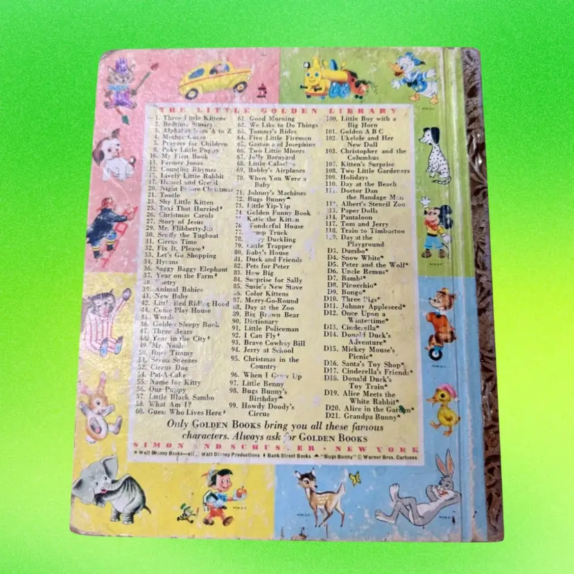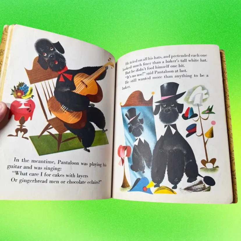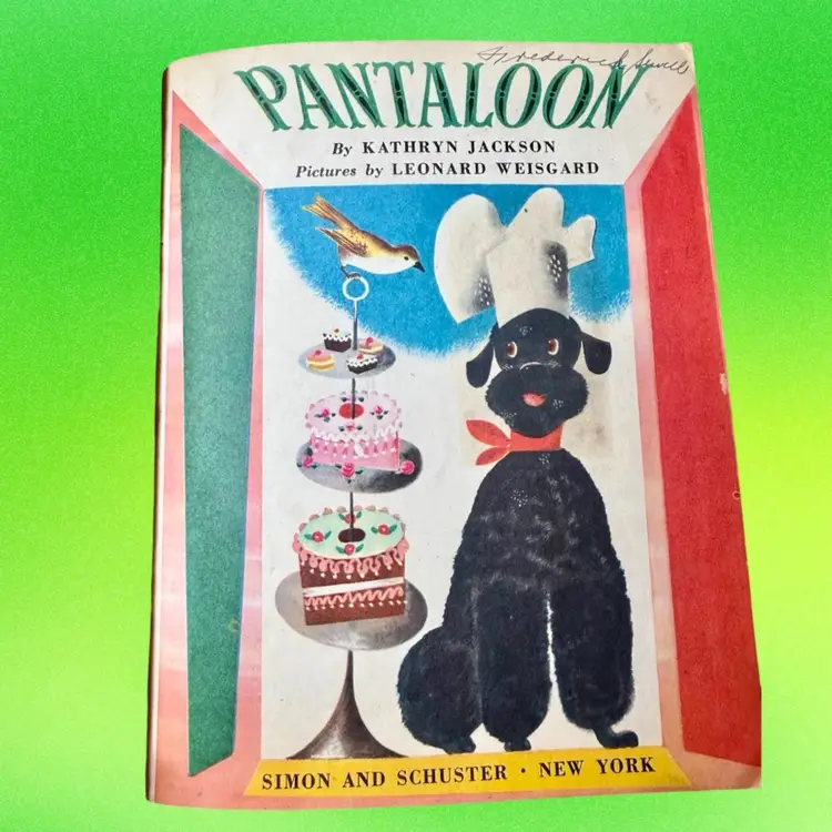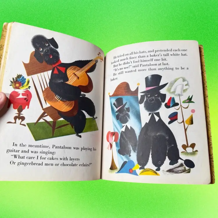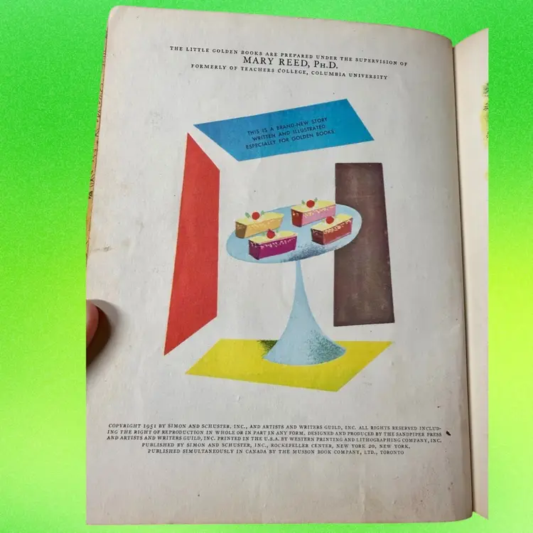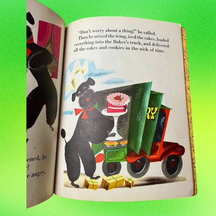 1951 Little Golden Book featuring a darling poodle in a bakery. Front cover has a window cut-out to show poodle peeking through window. Good vintage condition overall, no major issues. One thing to note - Cover has a smudge of something on it, I have not attempted to clean or remove. First page has child’s name written in pen.