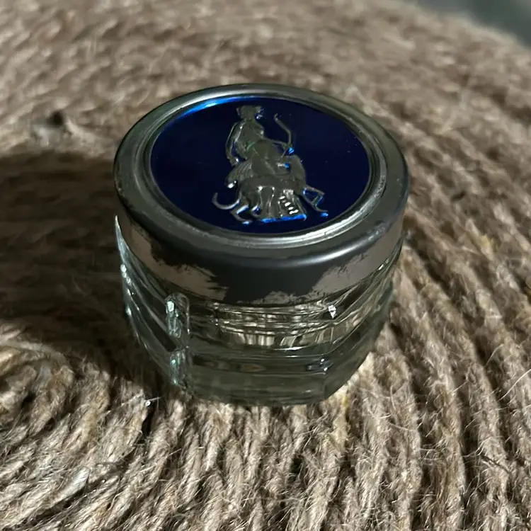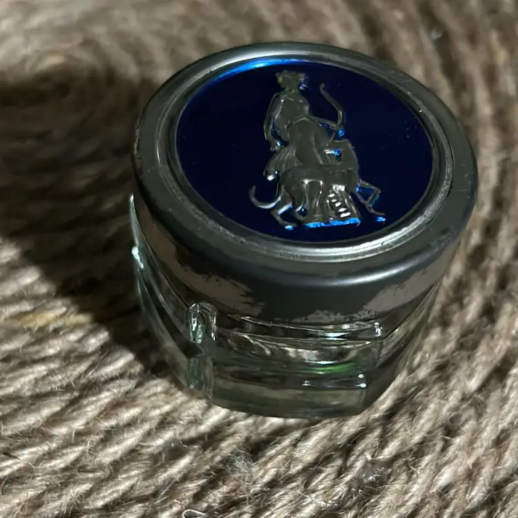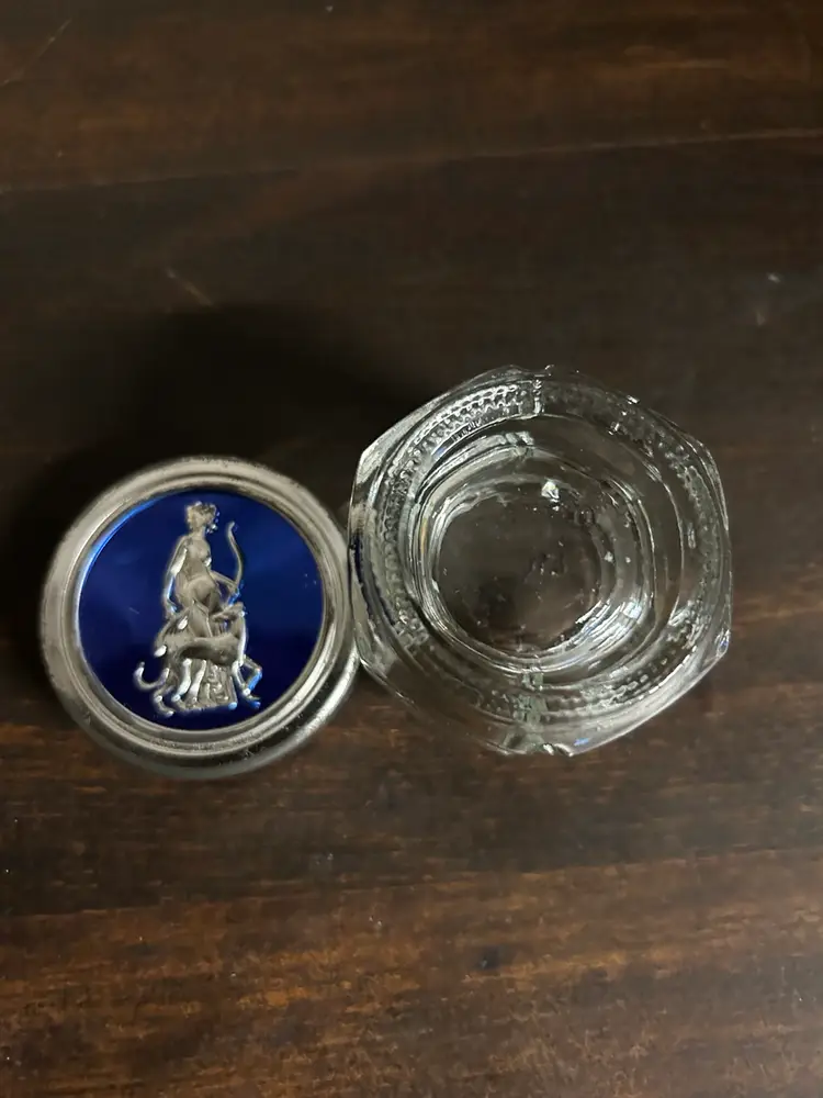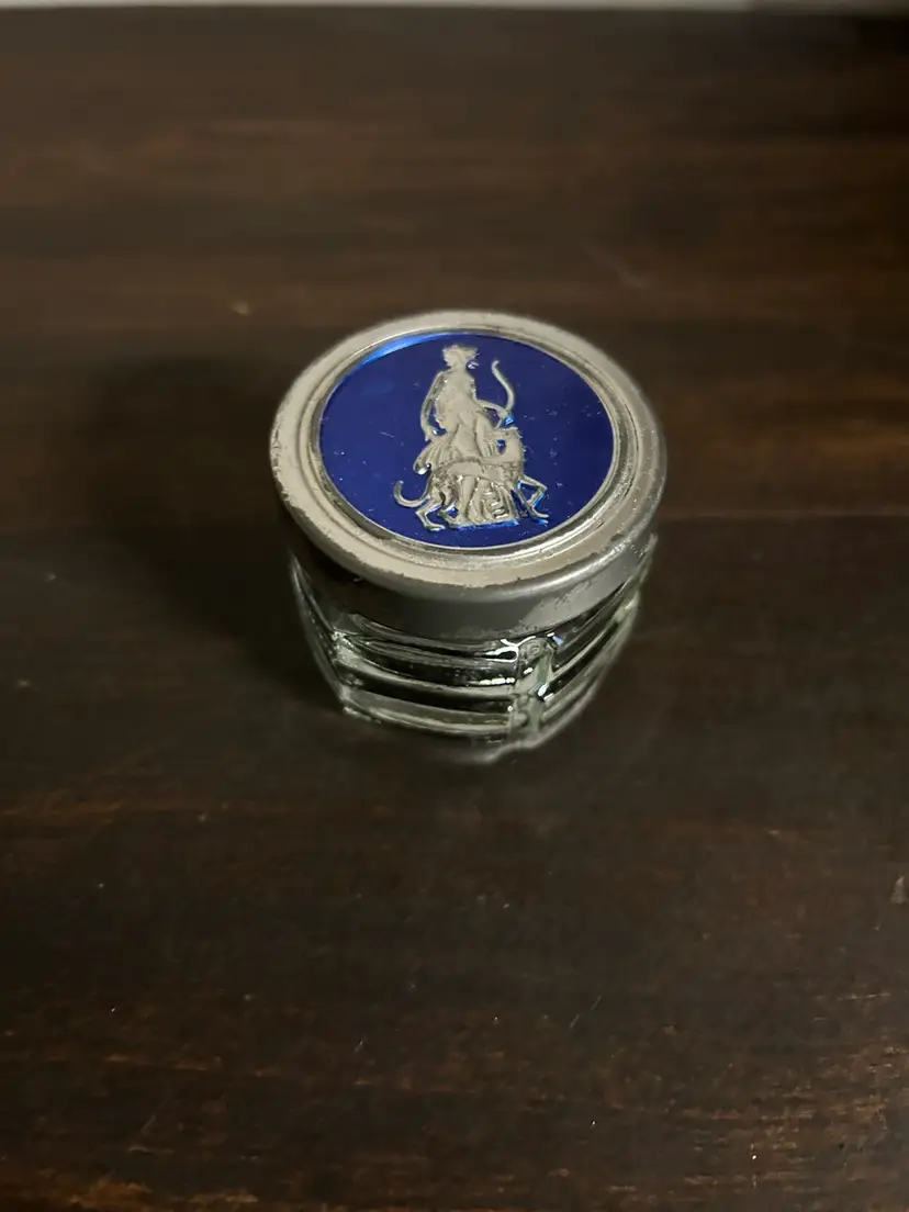 Cute little jar from way back when Avon was all the rage. The lid has some discoloration as seen in the photos. Item measures 1.5 inches tall by 1.75 inches wide and hexagon shape (six sides).