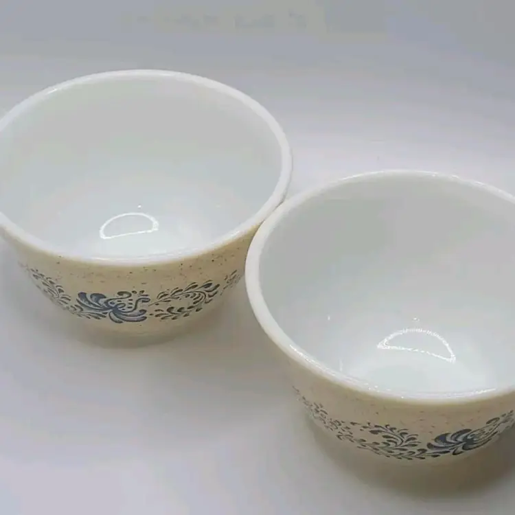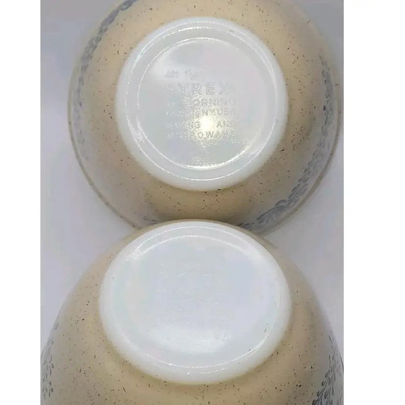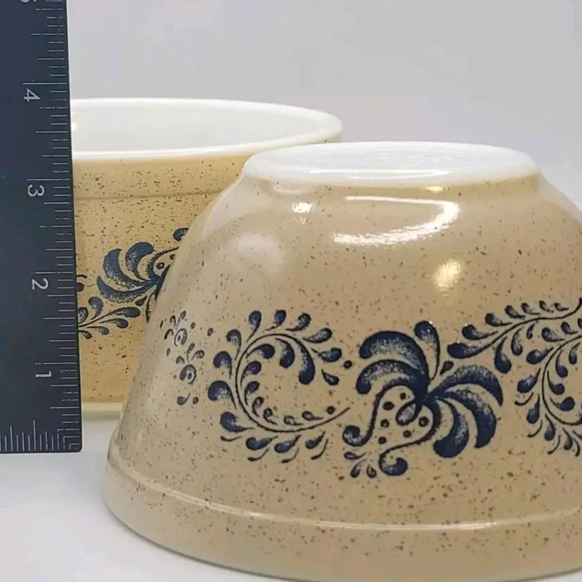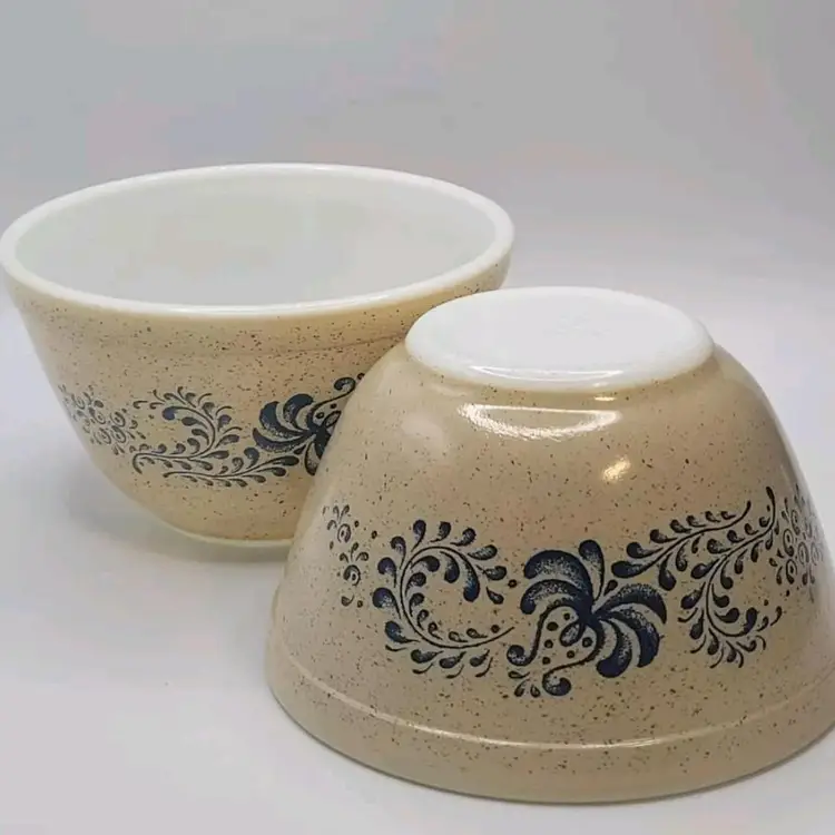 1976 Pyrex Homestead Speckled Tan/Blue Mixing Bowl 401 • S/2 • 1-1/2 pt • EUC Approx 3.25"H X 5.5"D at rim Very good vintage condition. Some line marks on bottom. No chips, cracks, or breaks. Areas of minimal wear. See pictures. *Beautiful color, very minimal wear.