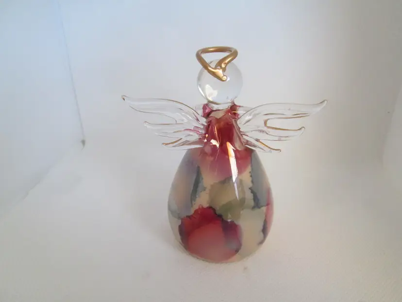 1980's Russ Berrie Angels of Love glass ornament. Very delicately blown. She measures 4" x 2 1/2" x 4" tall. In good condition.