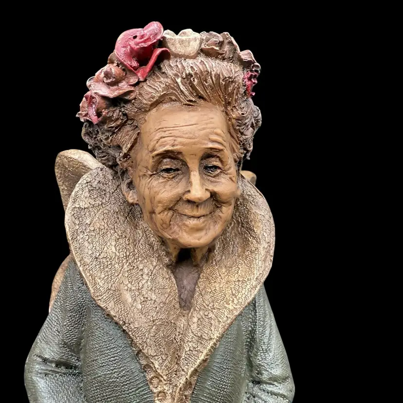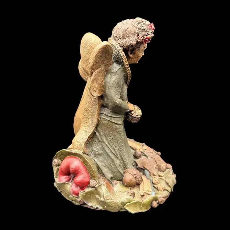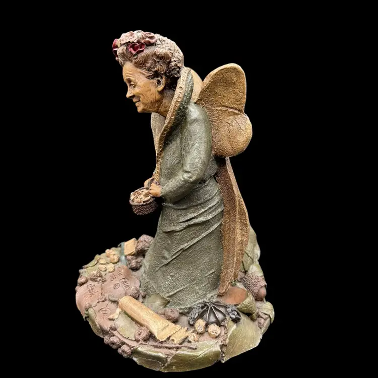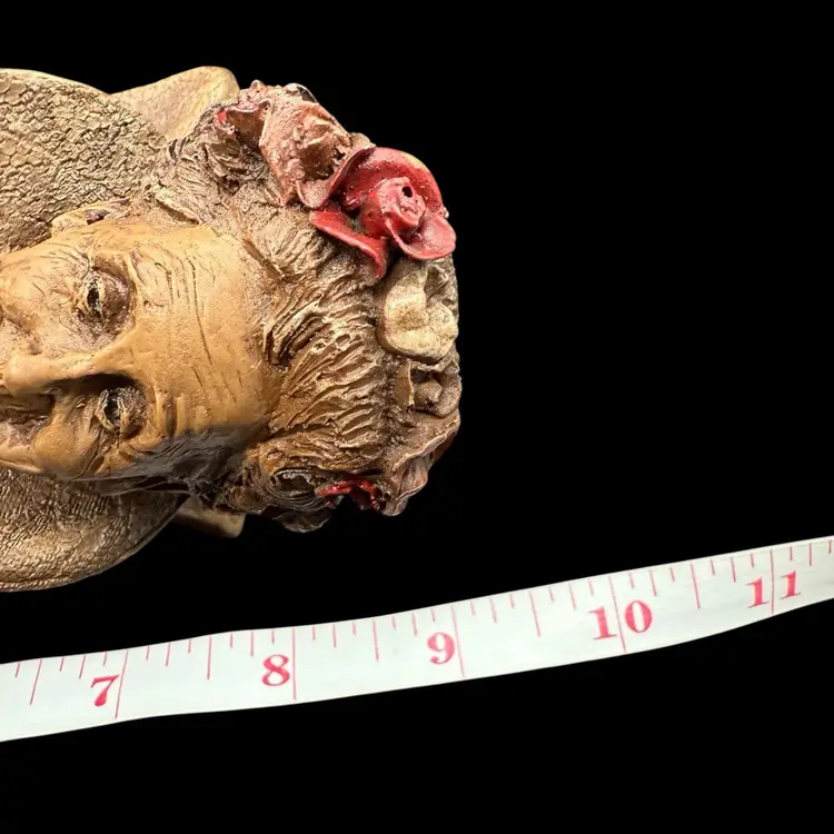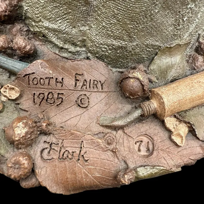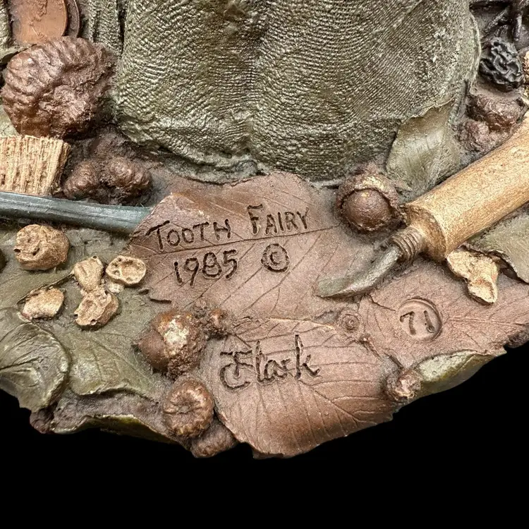 This 1985 Vintage Tom Clark Tooth Fairy Sculpture is a whimsical and collectible piece signed by the artist himself. Made of pecan resin, this limited edition sculpture features a multicolor design and depicts the fairy tale theme of fairies and fantasy. With its folk art style and unique all-over pattern, this sculpture is a charming addition to any collection or as a decorative piece for adults who appreciate quirky and playful items. The sculpture captures the essence of fairy tales, making it a delightful and special piece for collectors of Tom Clark's work.
