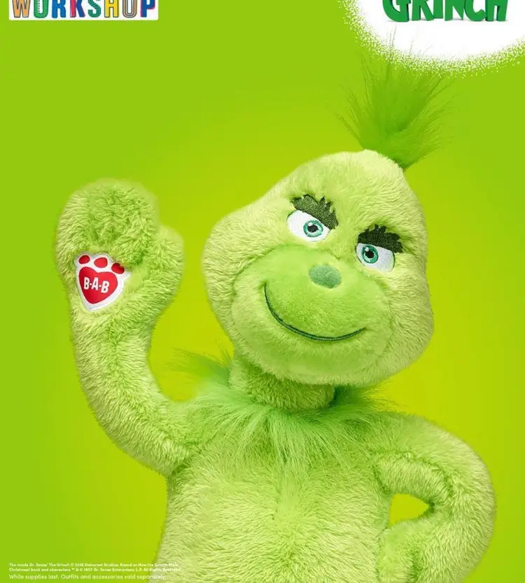 Build-A-Bear Grinch plush released in 2018 in conjunction with “The Grinch” movie release with Illumination, November 9th.