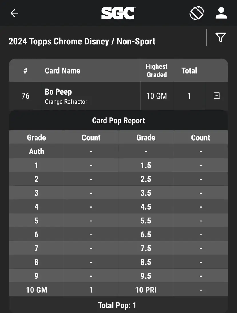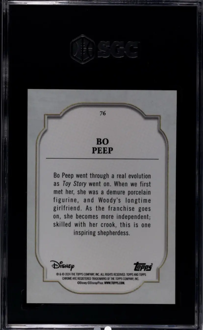 POP 1 – Only SGC 10 in existence. This card is the highest known grade for this parallel and character. With Toy Story 5 confirmed and Pixar Chrome rising in popularity, this is a true collector’s piece and long-term investment.