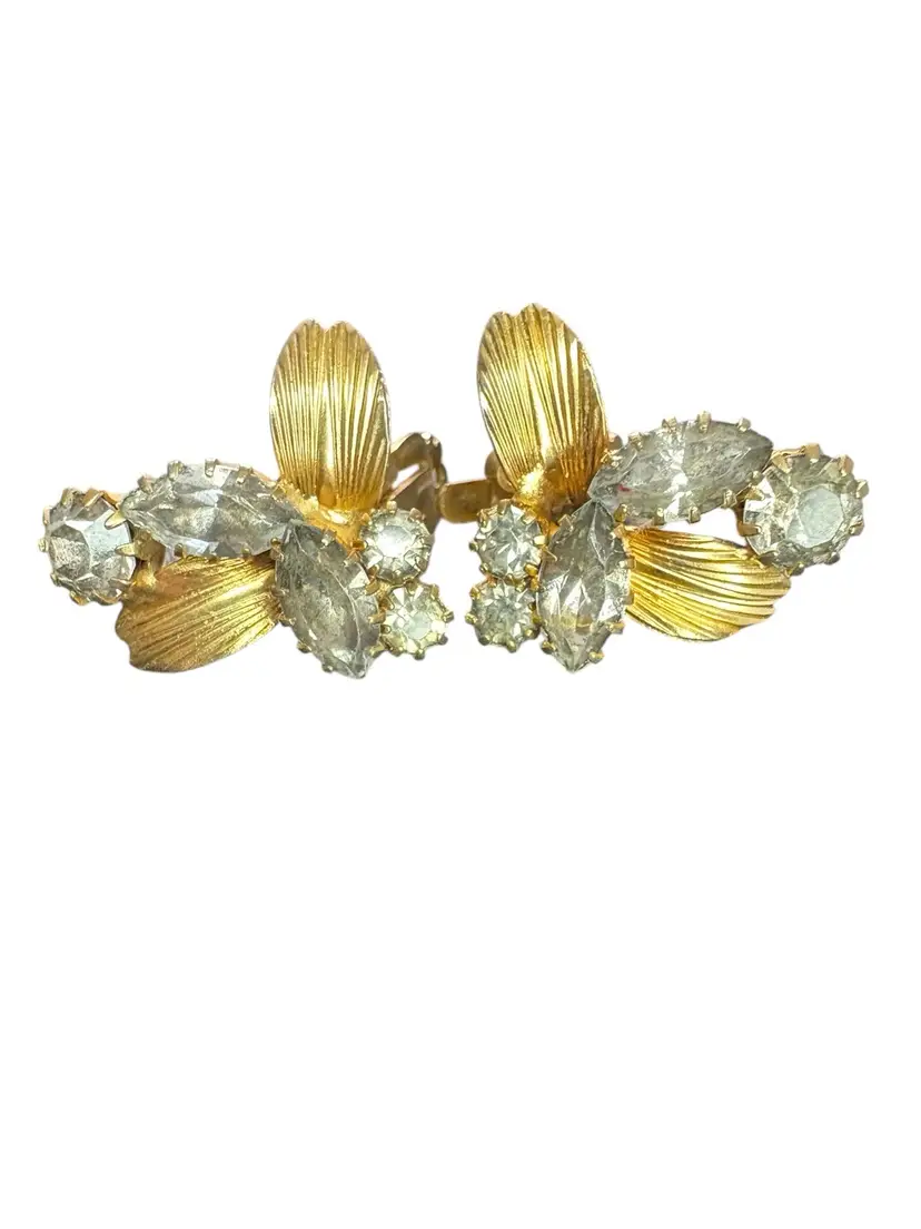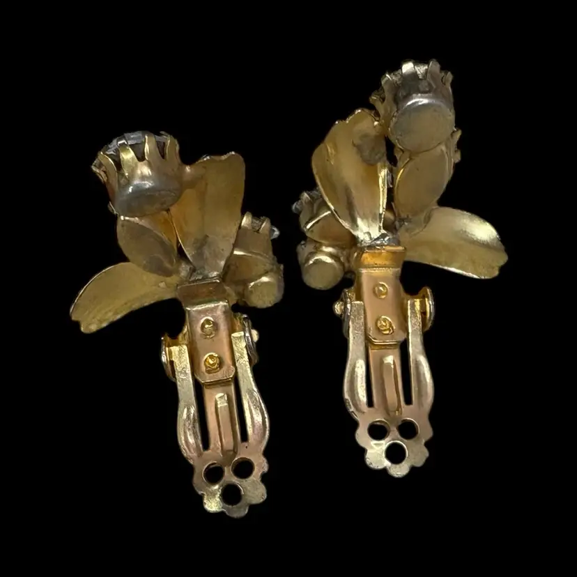 16in, slight loss on Goldtone petals. One dead rhinestone. Clip on earrings. No missing stones!