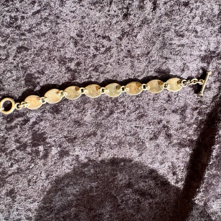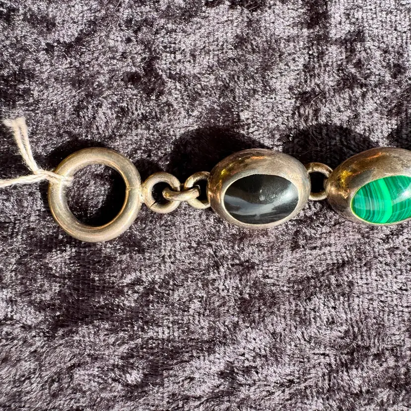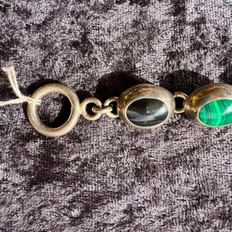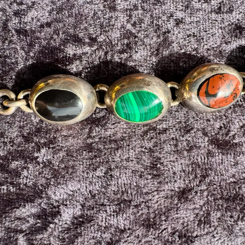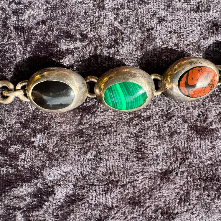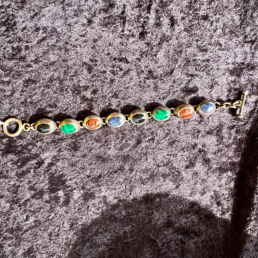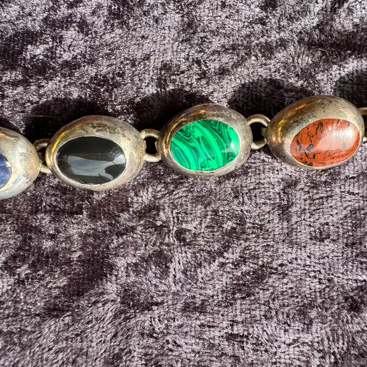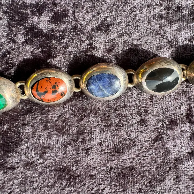 8 gemstones inlayed in sterling silver, Onyx, Tiger's Eye, Malachite, & Lapis. The back is closed with sterling. Measurements apx: 7" Long 34.2 grams