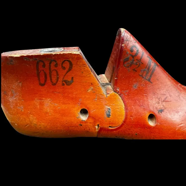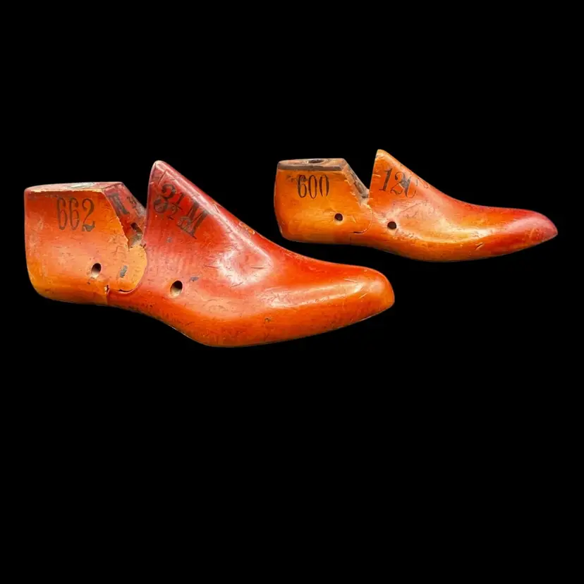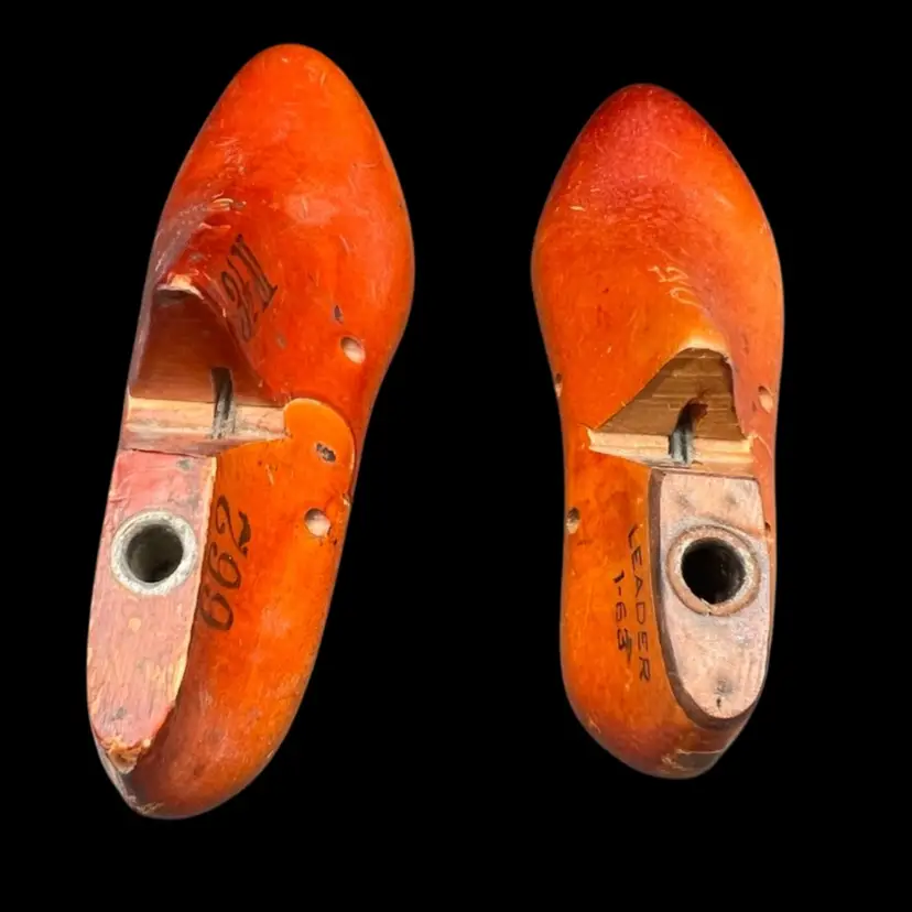 Pair Of Vintage/Antique Shoe Cobblers Wooden Shoe Forms Leader 1-63. 600 12C. McNichol & Taylor 8-58 662 3 1/2M In good used vintage condition Both have great patina and varying wood tones. Measurements: Leader 7 1/2” x 3” x 3” tall McNichol & Taylor 8 3/4” x 2 3/4” x 3 1/2” tall