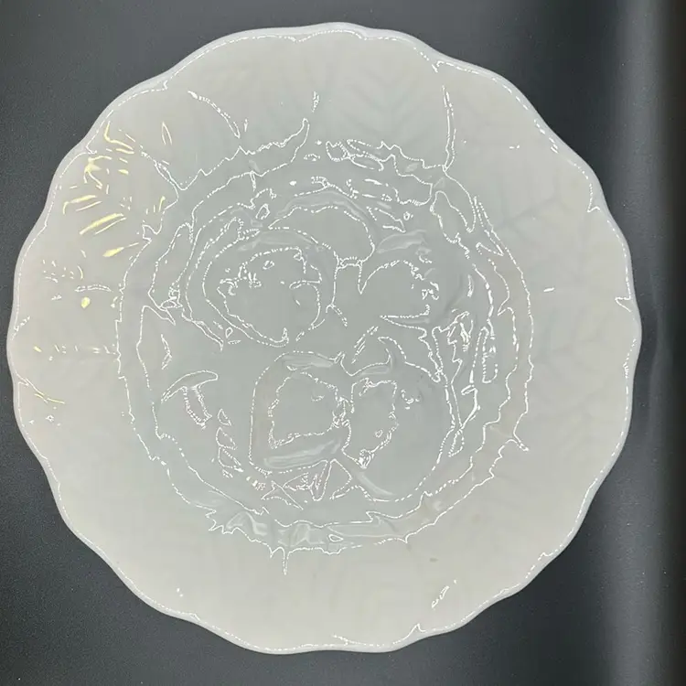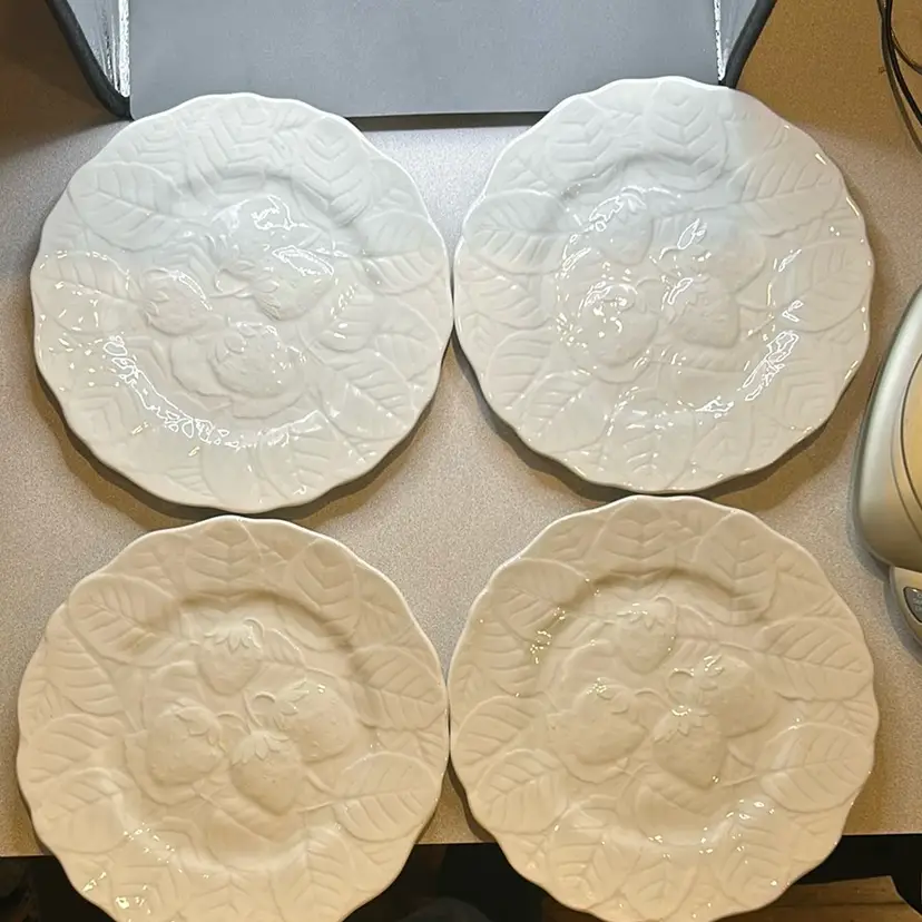 Here we have a set of 4 salad/desert plates. All 4 are a stark white. In my picture 2 of them look yellow. They are not. All same color. Some crazing. No chips or cracks. Measures 7.5 inches.