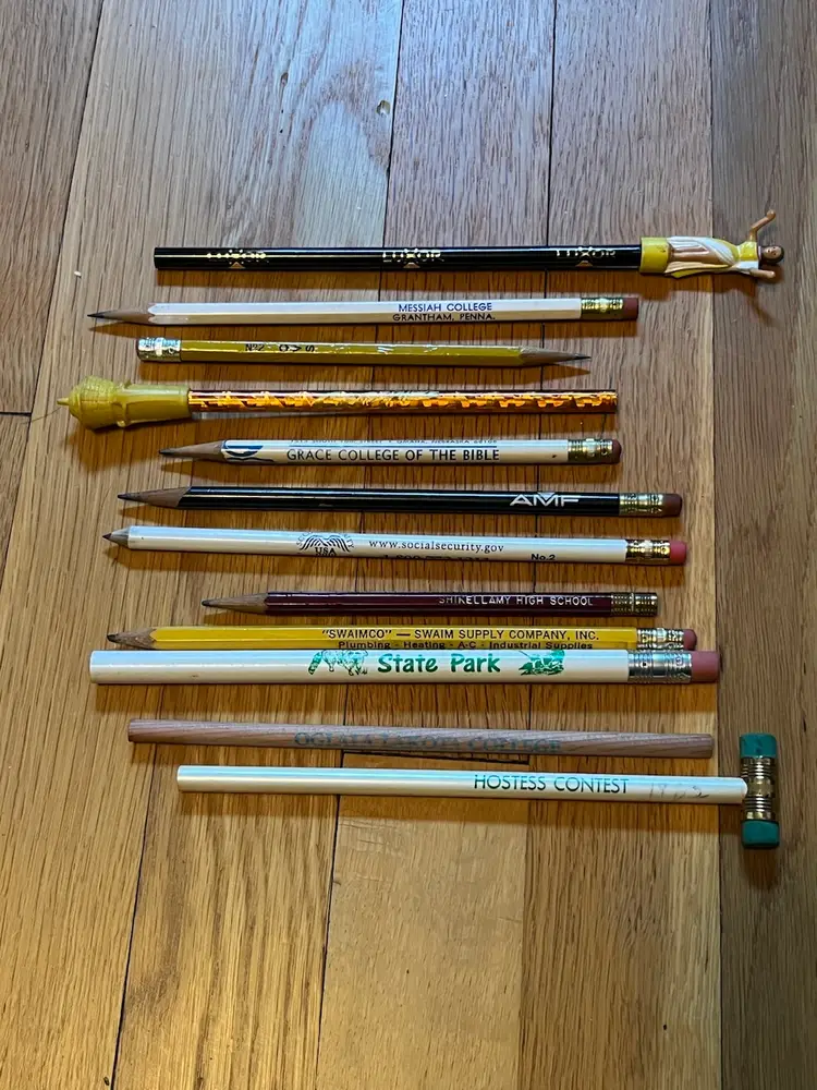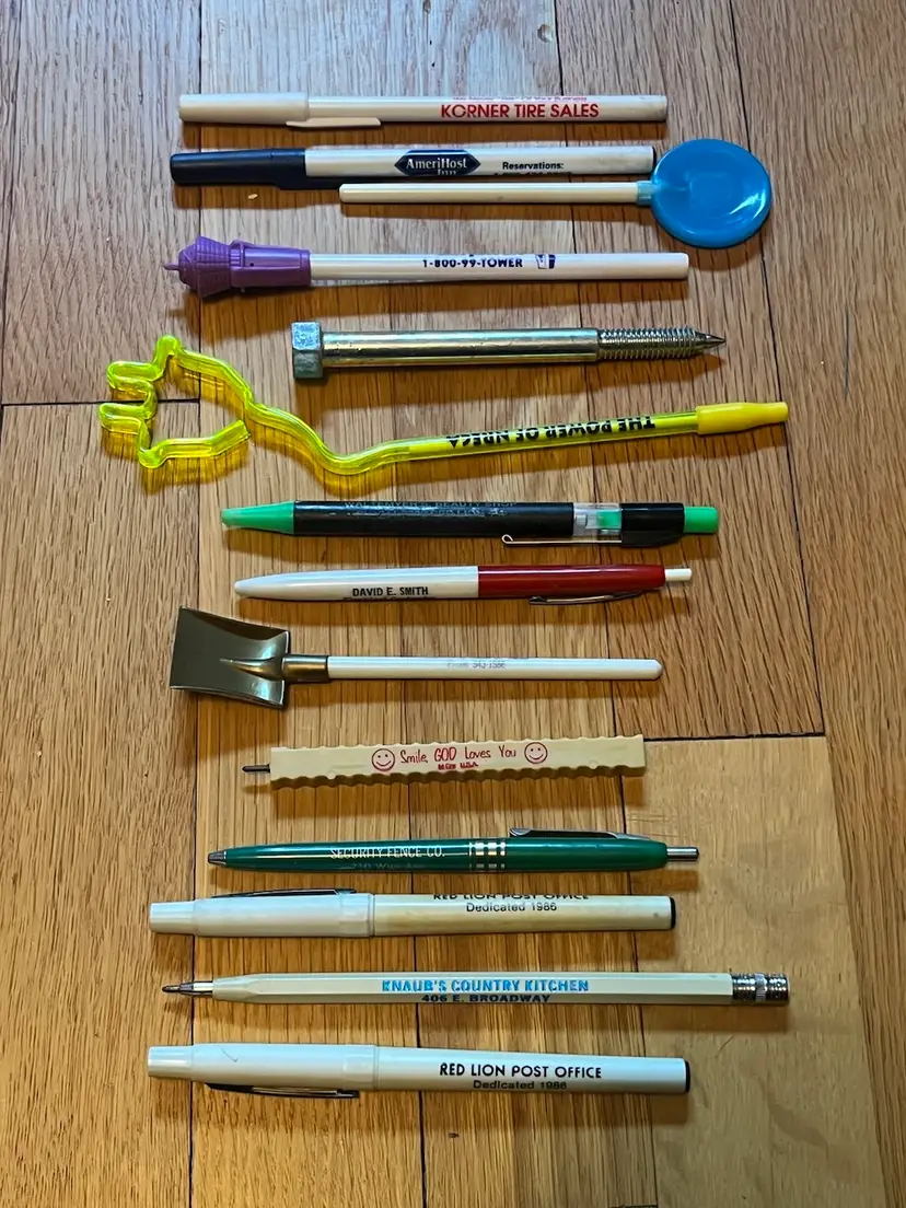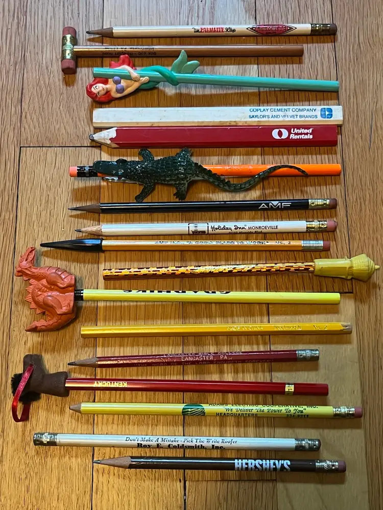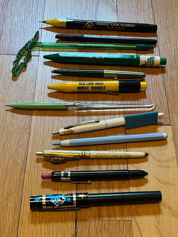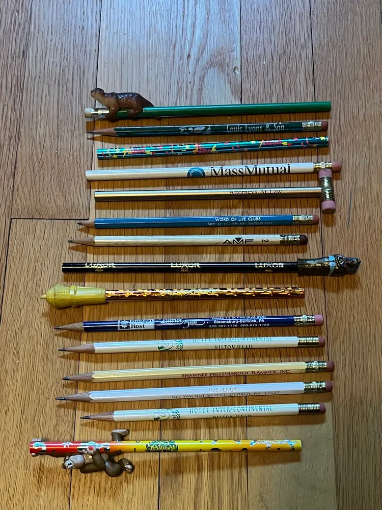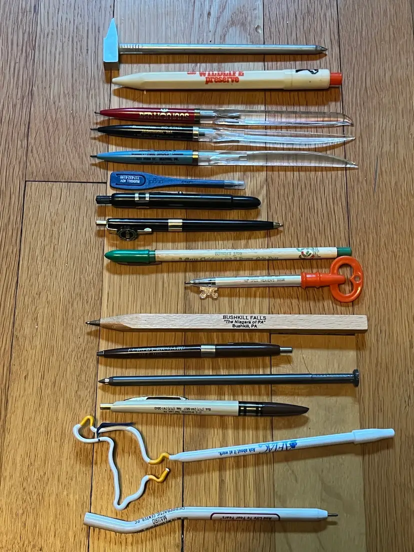Mixture of pens & pencils, some with letter openers, figural ends, some sharpened, some not. Not all pens are tested.