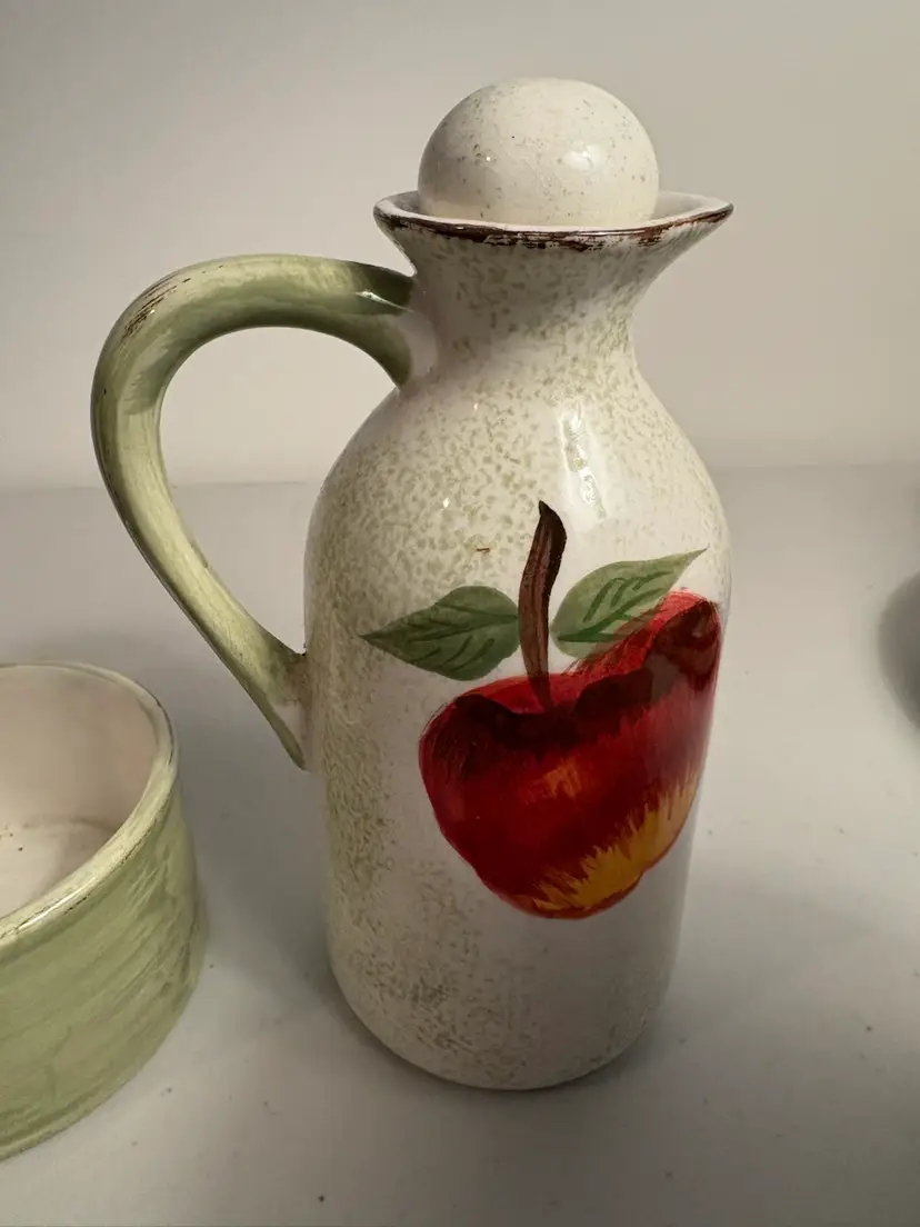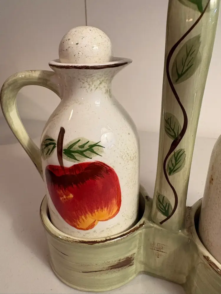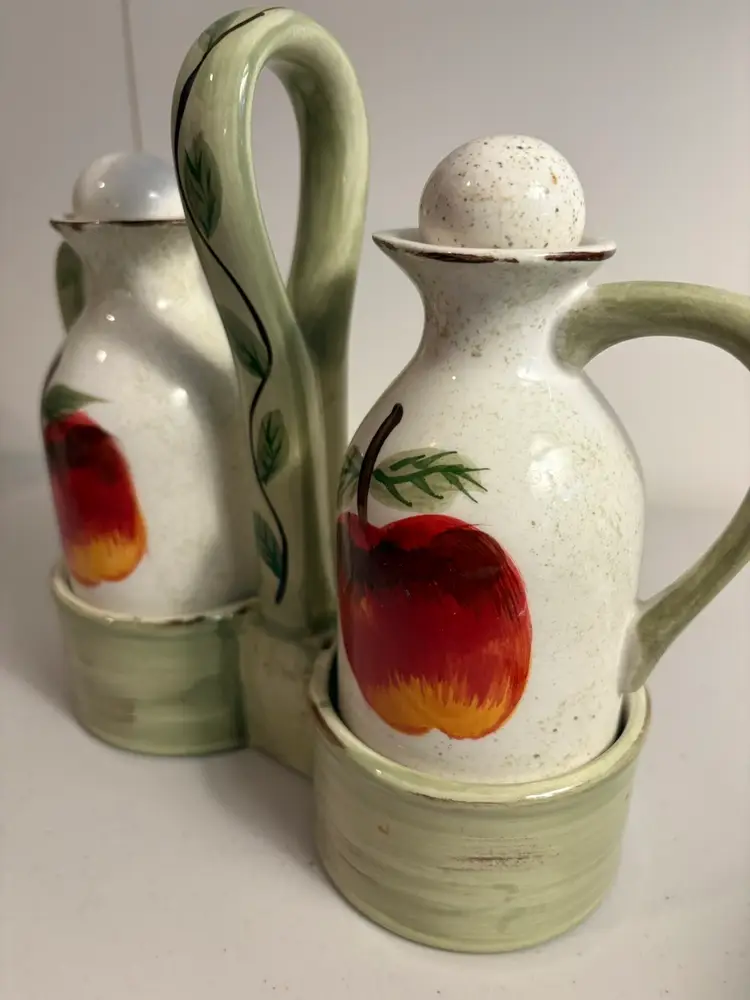 The 80s Cruet Set by Cambridge Potters features a charming apple design, with a ceramic material that holds oil and vinegar. The set includes a stand, making it easy to serve and store these condiments while still adding a touch of vintage style to your dining table. Perfect for anyone looking to add a unique and decorative piece to their serveware collection, this cruet set is both functional and visually appealing.