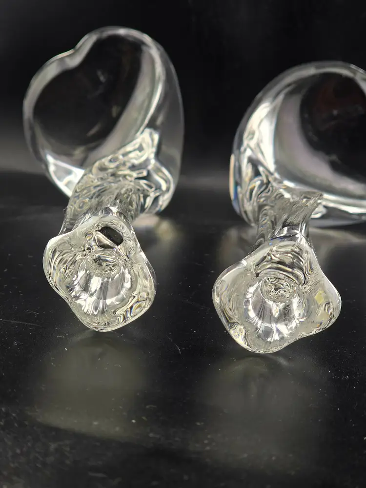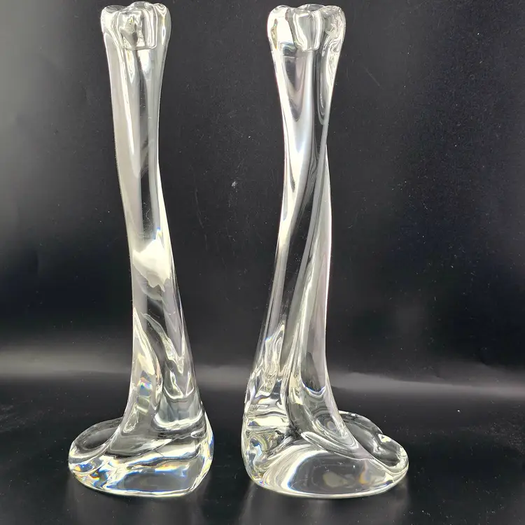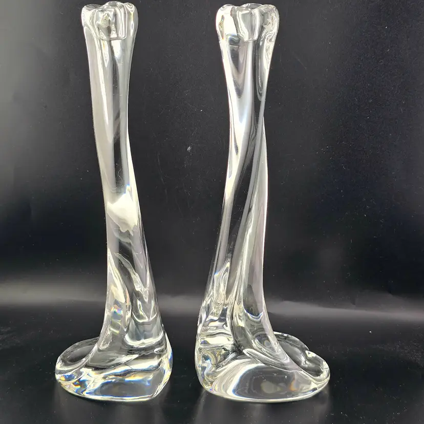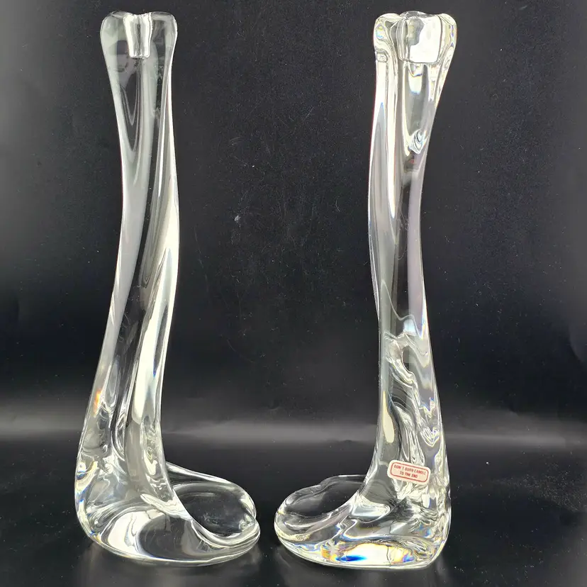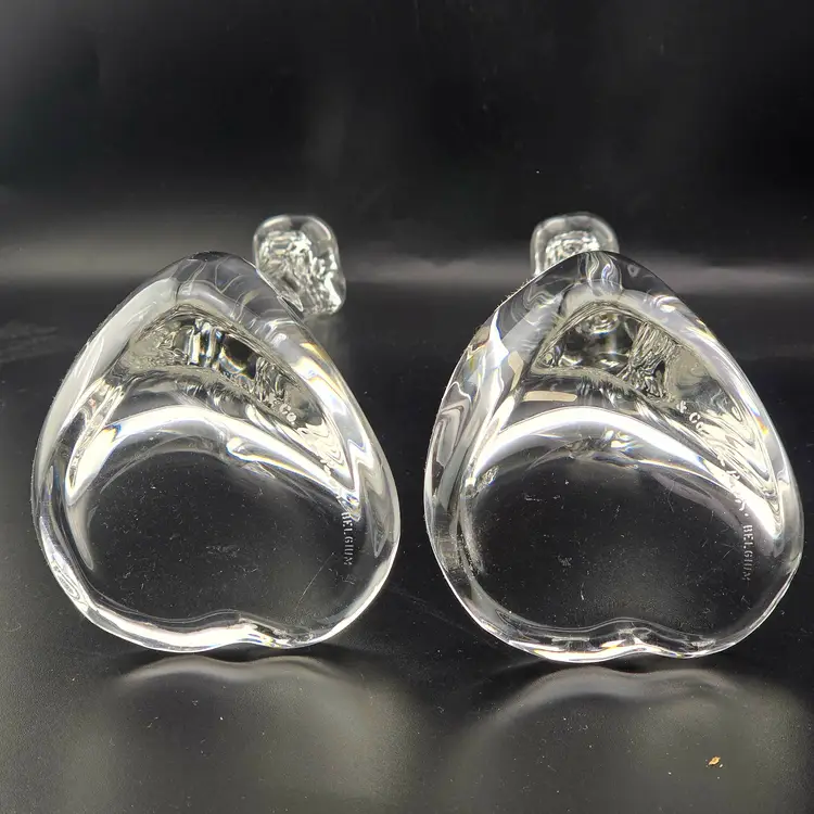 Retired Stunning Pair of Belgium Marked Tiffany and CO Crystal Glass Candlestick Holders by the artist Elsa Peretti. Each one is marked by artist, place of origin and trademark. Excellent condition minus just a few minor surface scratches. 9.25 inches tall