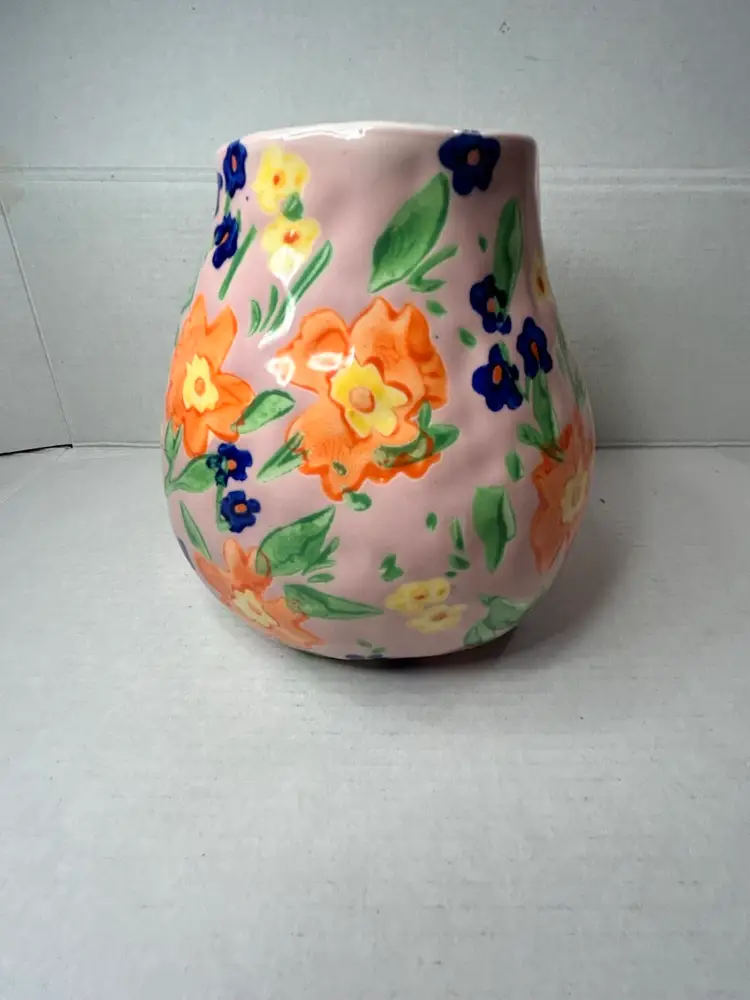 The hand-painted ceramic vase features a pink base with vibrant orange, blue, and yellow floral patterns and green foliage.