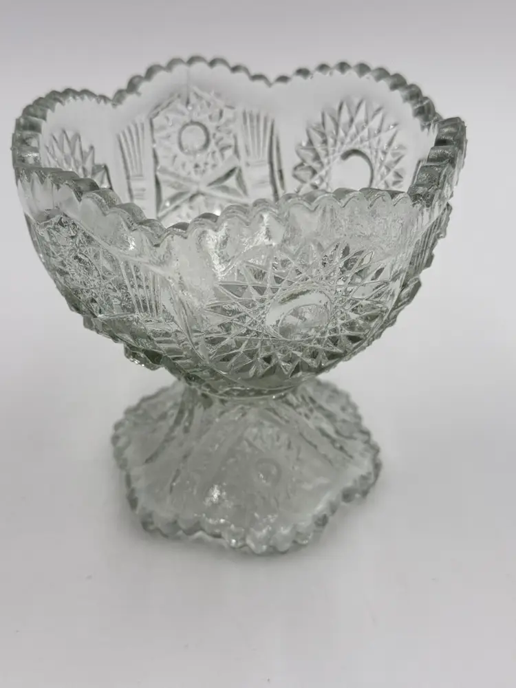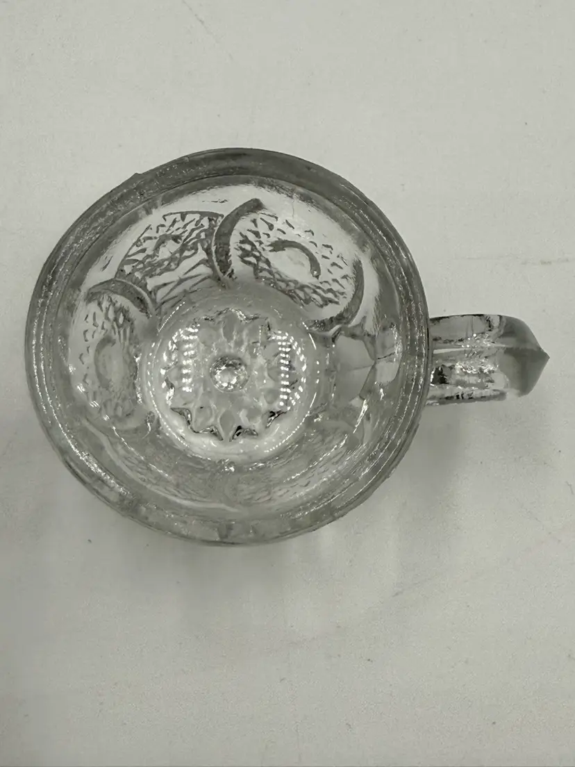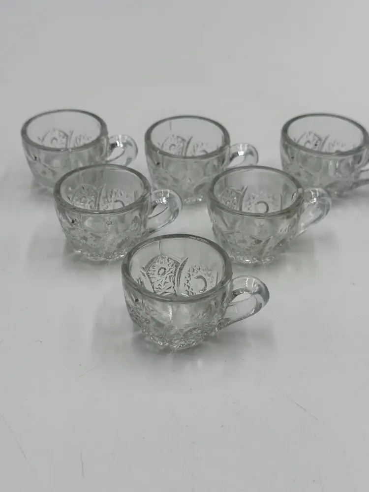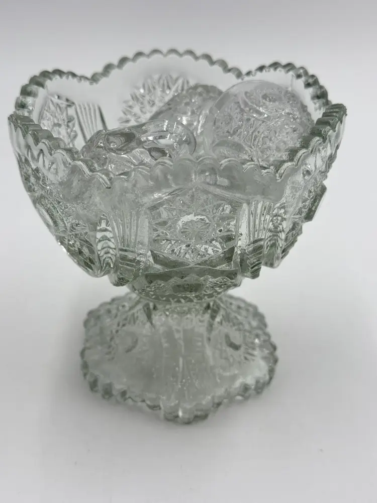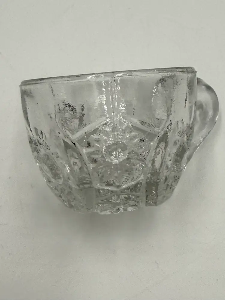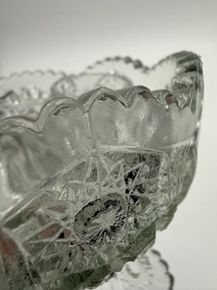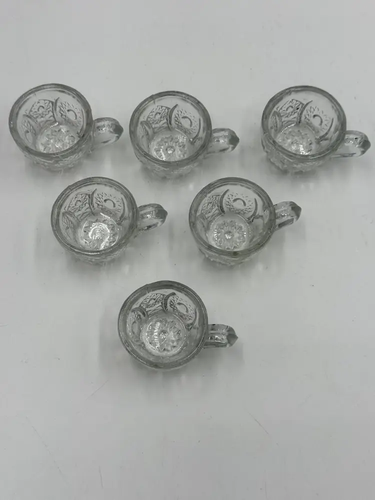 Has a sawtooth rim. In good condition. Does not have any cracks. There are minor flea bites on the rim of the punch bowl in a couple of spots. Dates to around 1908-1910. The punch bowl measures4 1/2 inches tall and 4 1/2 inches in diameter. The cups measure 1 1/8 inches tall and 1 1/2 inches in diameter.
