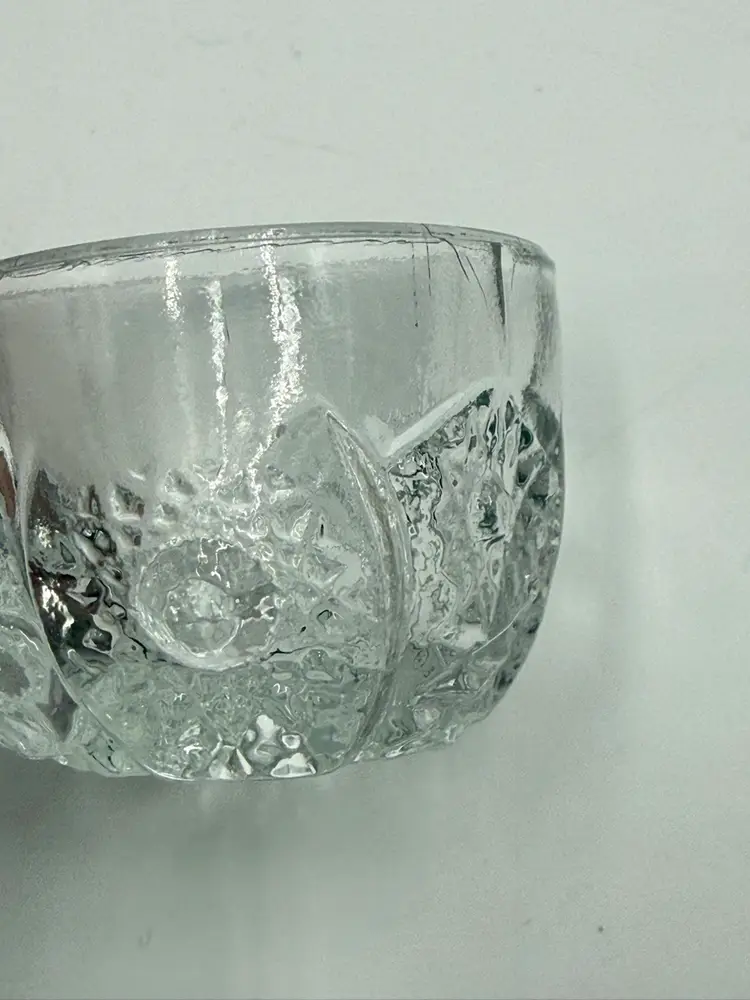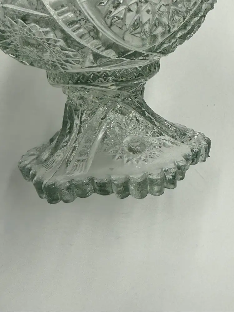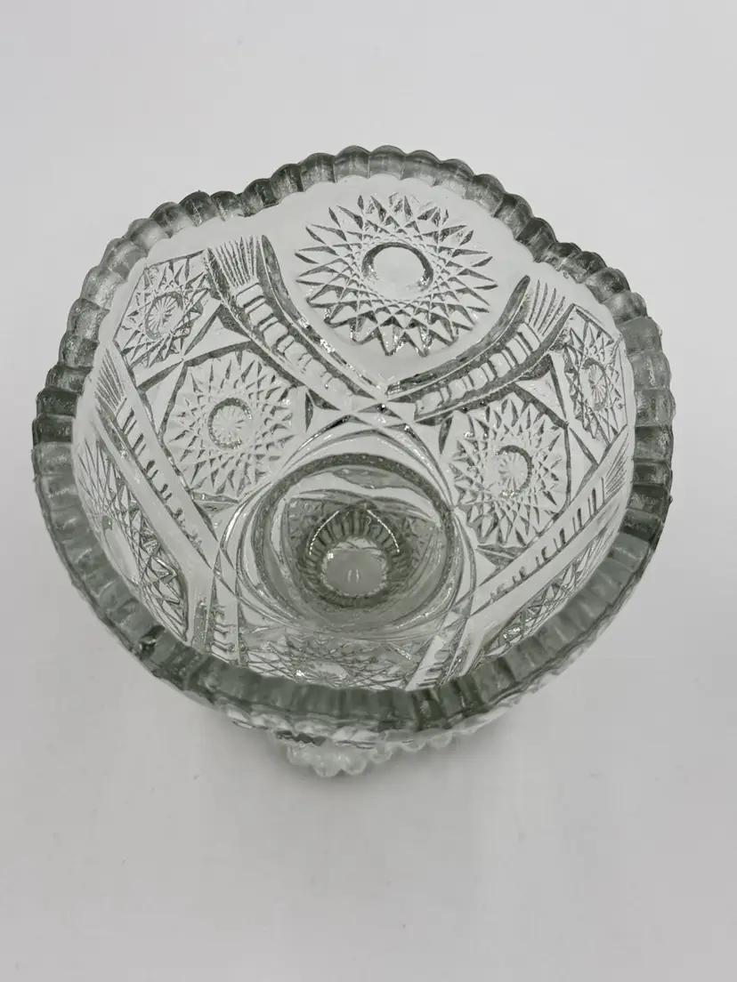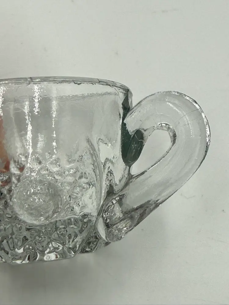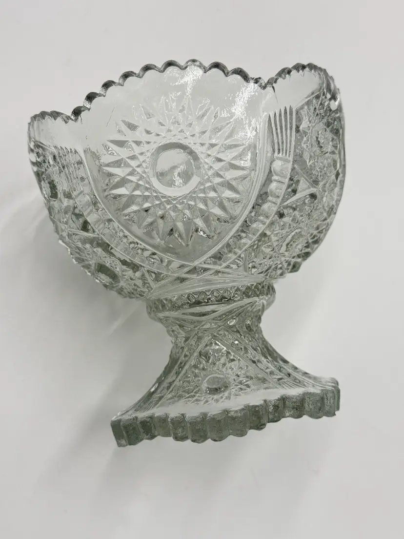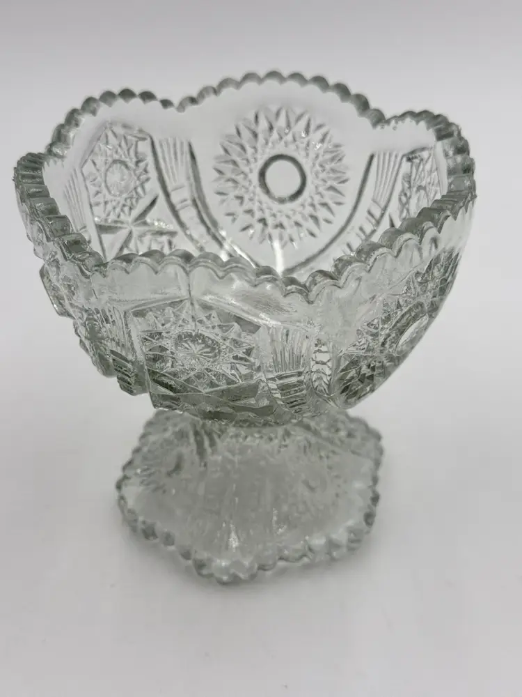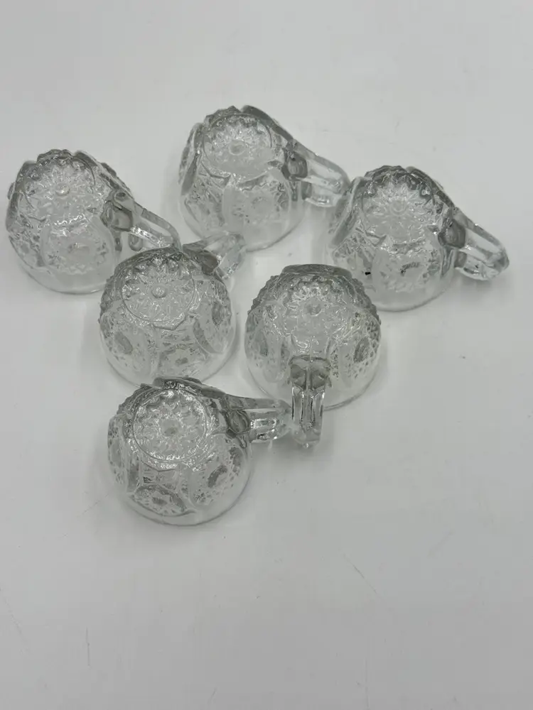 Has a sawtooth rim. In good condition. Does not have any cracks. There are minor flea bites on the rim of the punch bowl in a couple of spots. Dates to around 1908-1910. The punch bowl measures4 1/2 inches tall and 4 1/2 inches in diameter. The cups measure 1 1/8 inches tall and 1 1/2 inches in diameter.