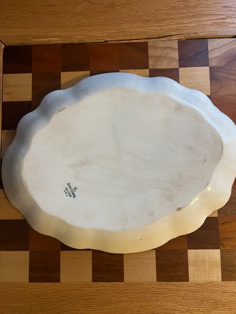 This particular platter, likely from the "Hudson" series, showcases the typical decorative style of the era. The scalloped edge and the presence of crazing in the glaze are common characteristics of older ceramic pieces, indicating age and use. Such platters were essential serving pieces in dining rooms and are now sought after by collectors for their historical significance and aesthetic appeal.