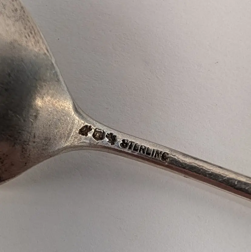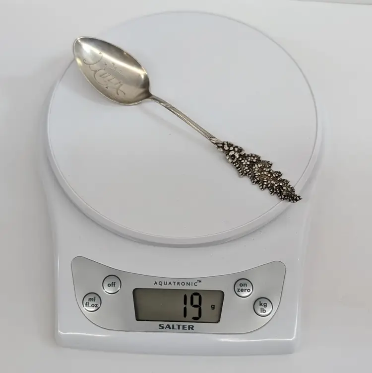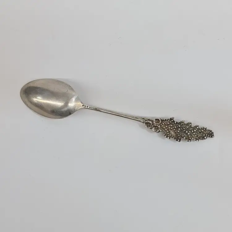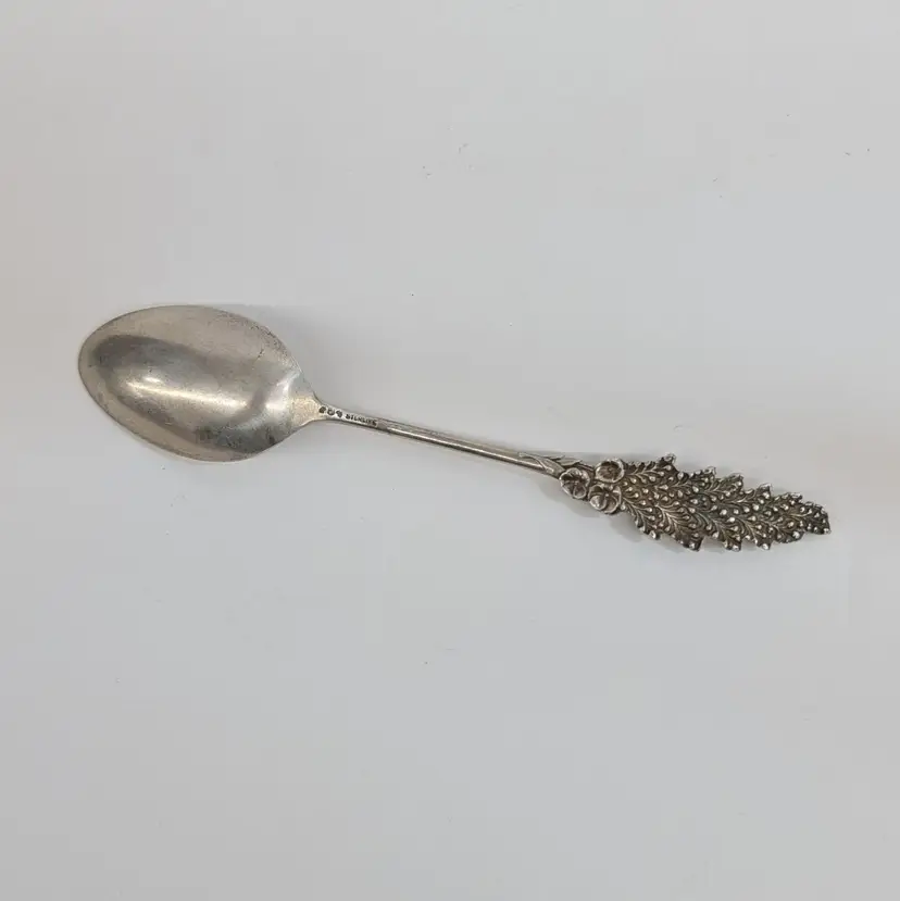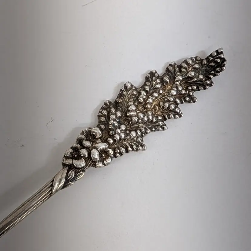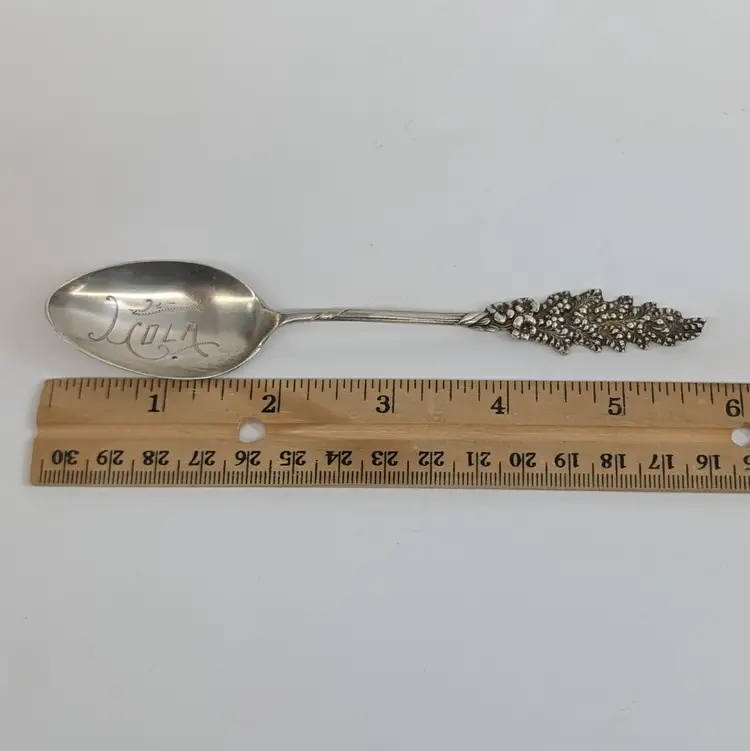 Beautiful, sterling spoon with a floral goldenrod top and a monogramed spoon with the Norse name, Uola. In nice, used condition with minor tarnish and wear (see pictures). Measurements ~ 5.75" long and 19 grams