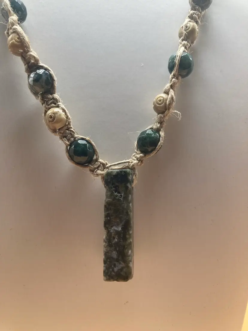 Handmade hemp necklace features a rectangular aventurine pendant. The stone is centered among green agate beads and carved tan soapstone beads. Necklace features a bead and toggle style closure. Necklace measures 22 inches.