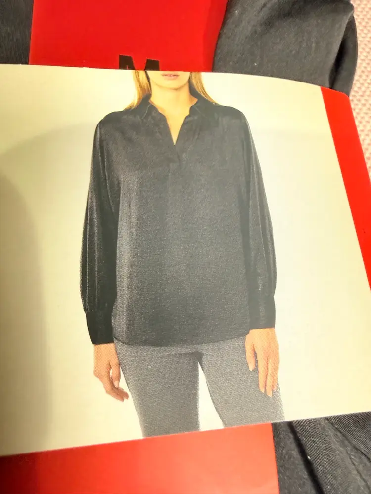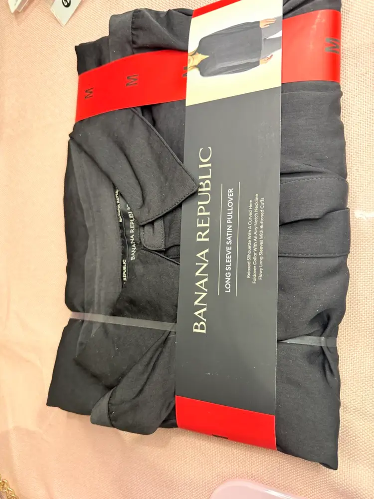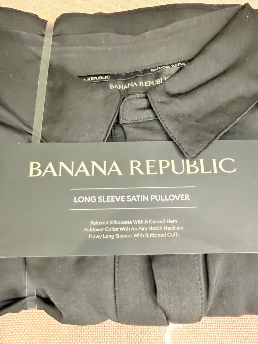 Keywords: Banana Republic, black top, long sleeve, women's pullover, notch neck, flowy sleeves, casual wear, relaxed fit, solid pattern, buttoned cuffs, polyester, medium size, basic style, women's fashion.