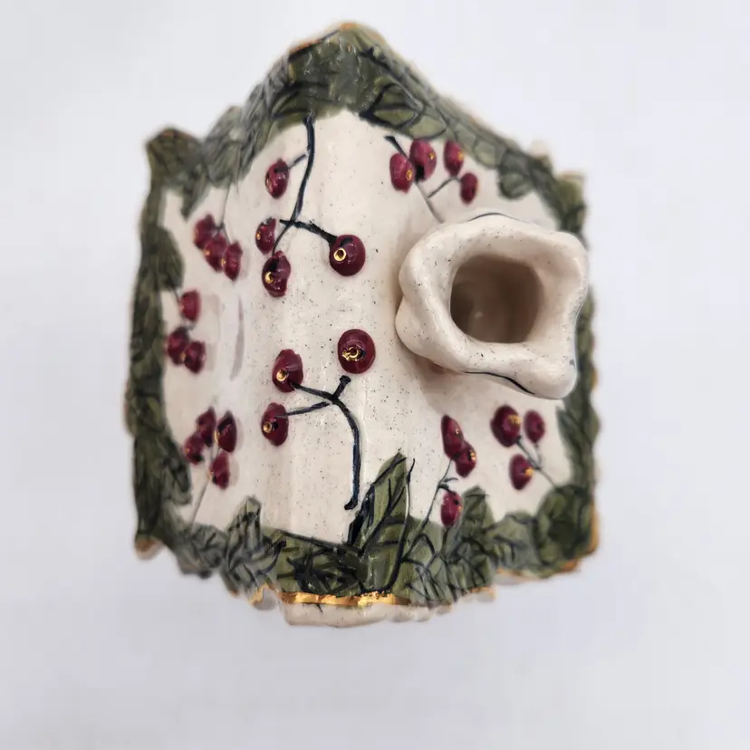 Like all Blue Sky Candleholders, this cottage is so charming with holly berries everywhere, pine roping on the roof and a huge wreath above the open door - all sprinkled with gold! Can hold a tea light (included) or votive. Like New Condition: no signs of wear. Please Note: does not come with plate. Measurements: 4 3/4" long from snow tip on roof to edge of open door; 4 3/4" wide across the roof and 5" tall.