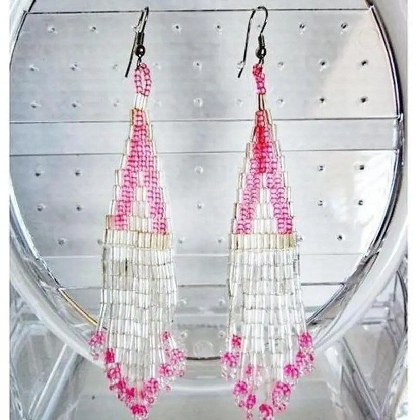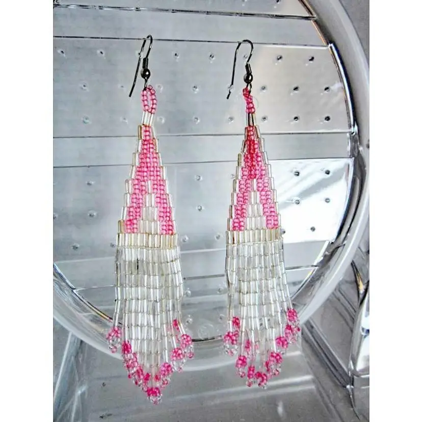 Bohemian pearly white and pink beaded fringe earrings. The earrings drop 5".