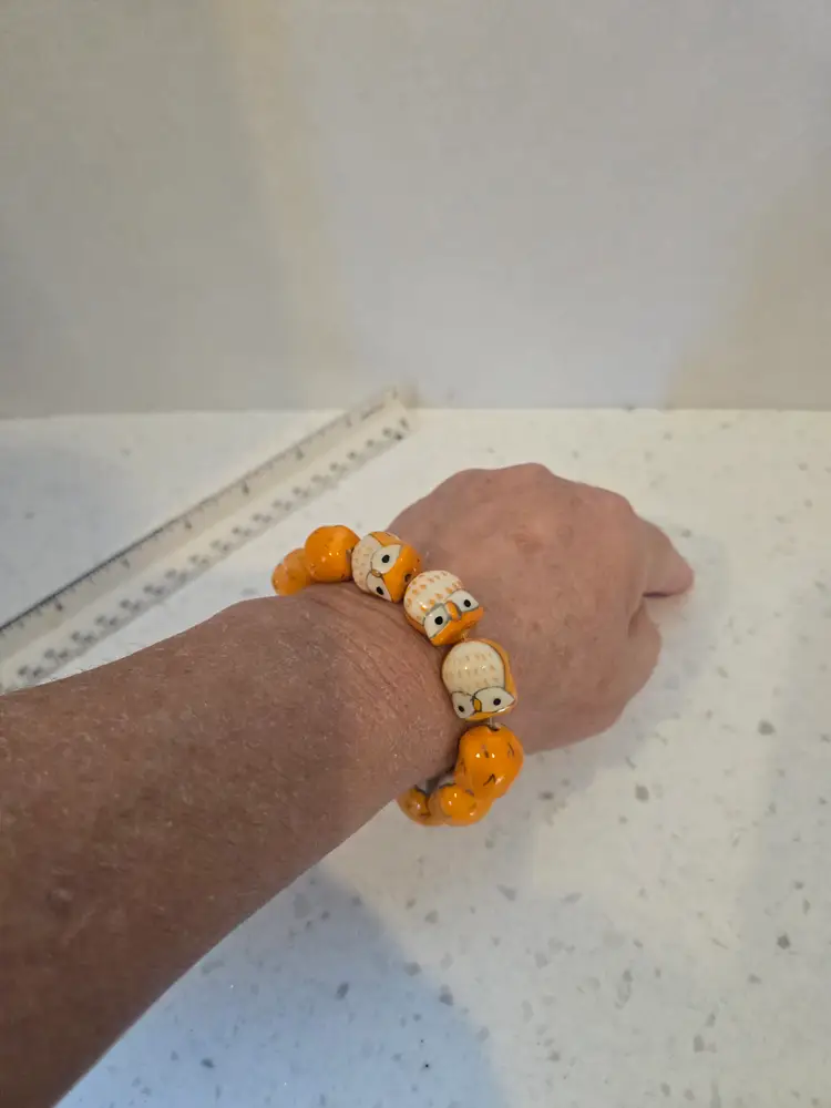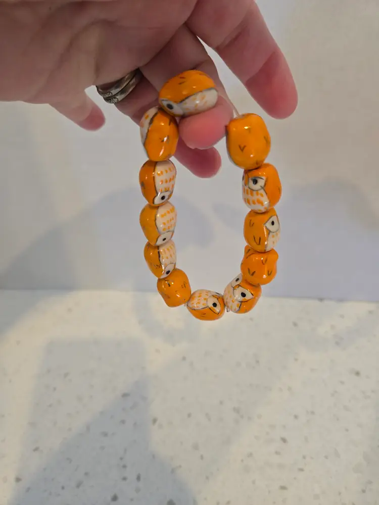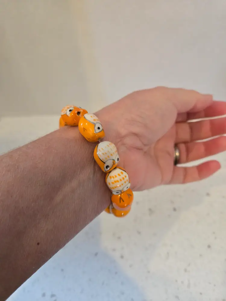 Super cute owl bracelet has ceramic orange and white owls. Medium to small wrist size, stretchy but not elastic. A crafty person could turn the beads into a fabulous project!