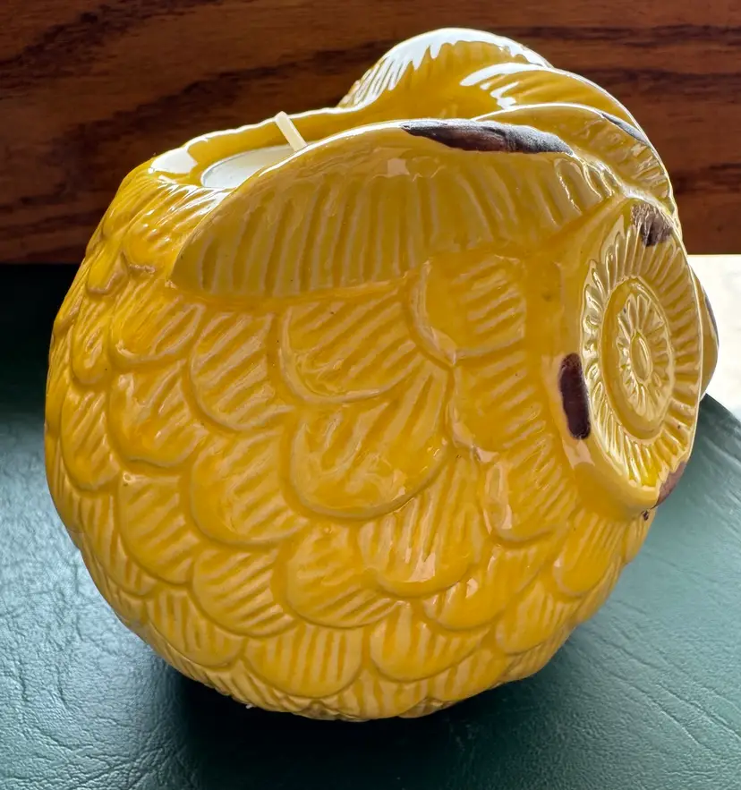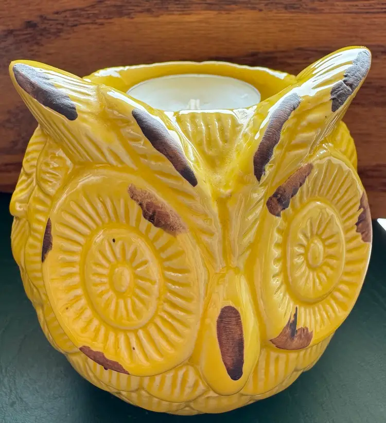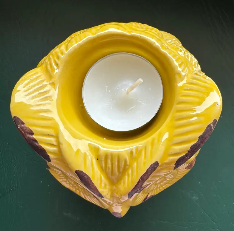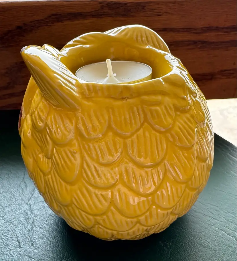 Ceramic Yellow Owl Tealight Candle Holder, Distressed Rustic Glazed Finish