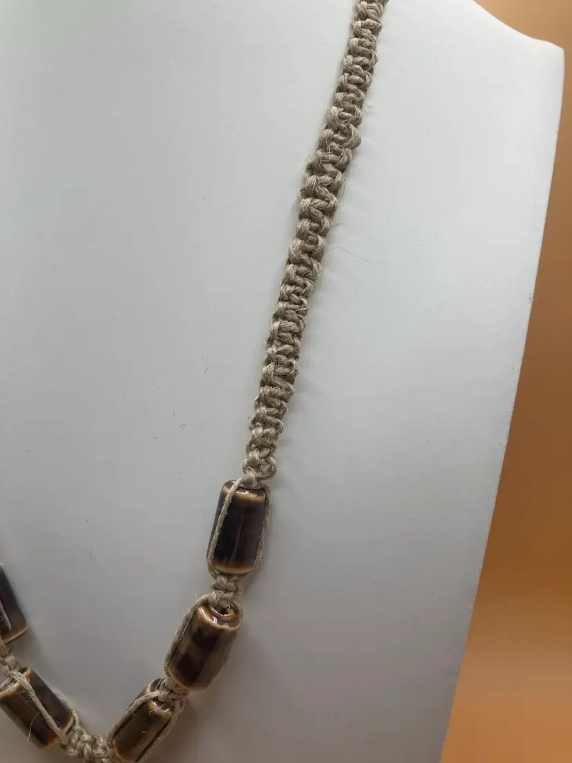 Handmade hemp necklace features a ceramic tooth pendant. The pendant is centered among brown ceramic beads. Necklace features a bead and loop toggle style closure. Necklace measures 21 inches.