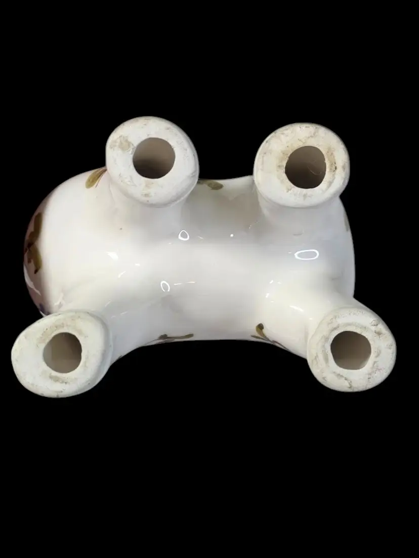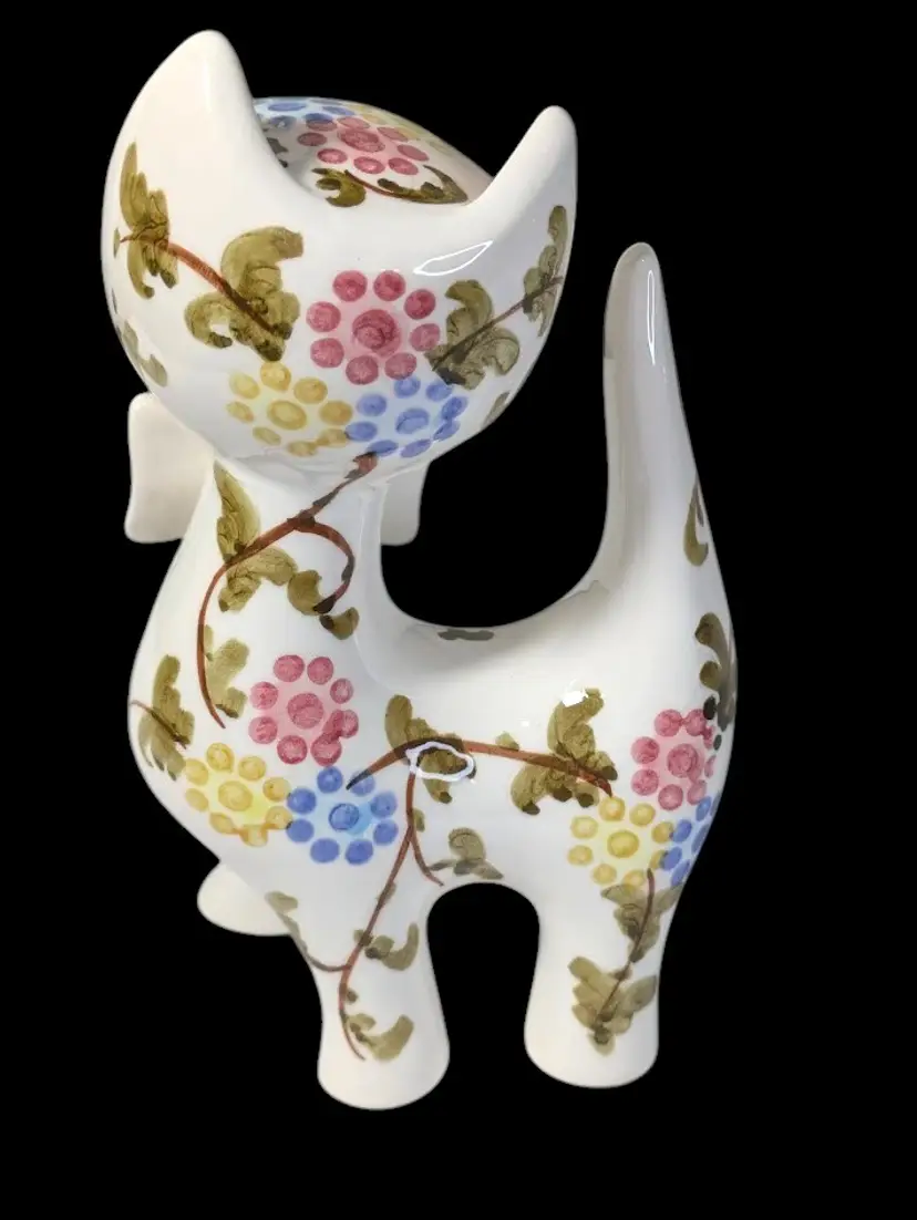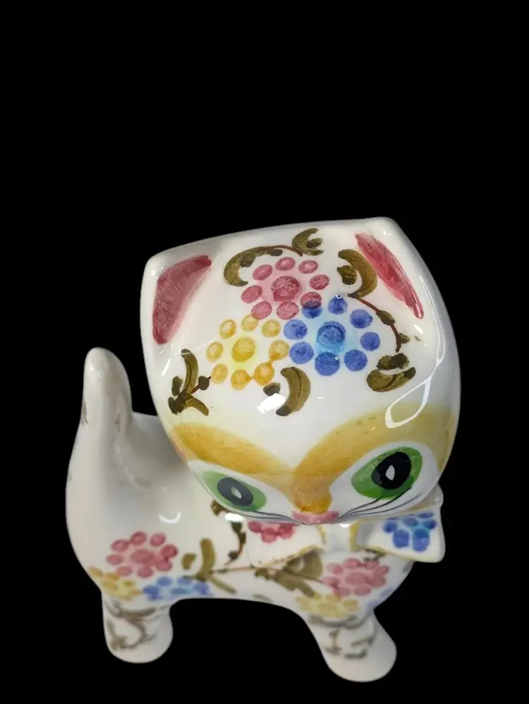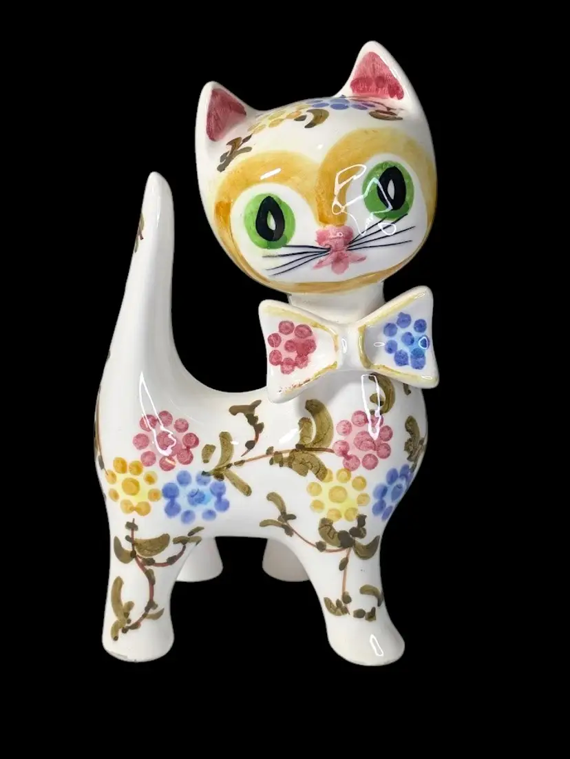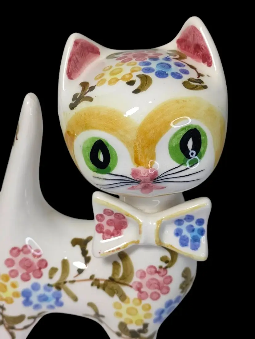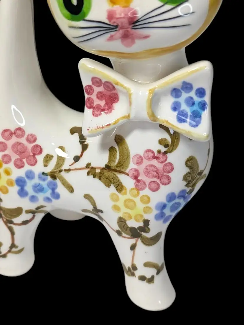 Charming Mid-Century Modern ceramic cat figurine featuring vibrant hand-painted florals and a cute bow tie. A stylish decorative piece with retro appeal.