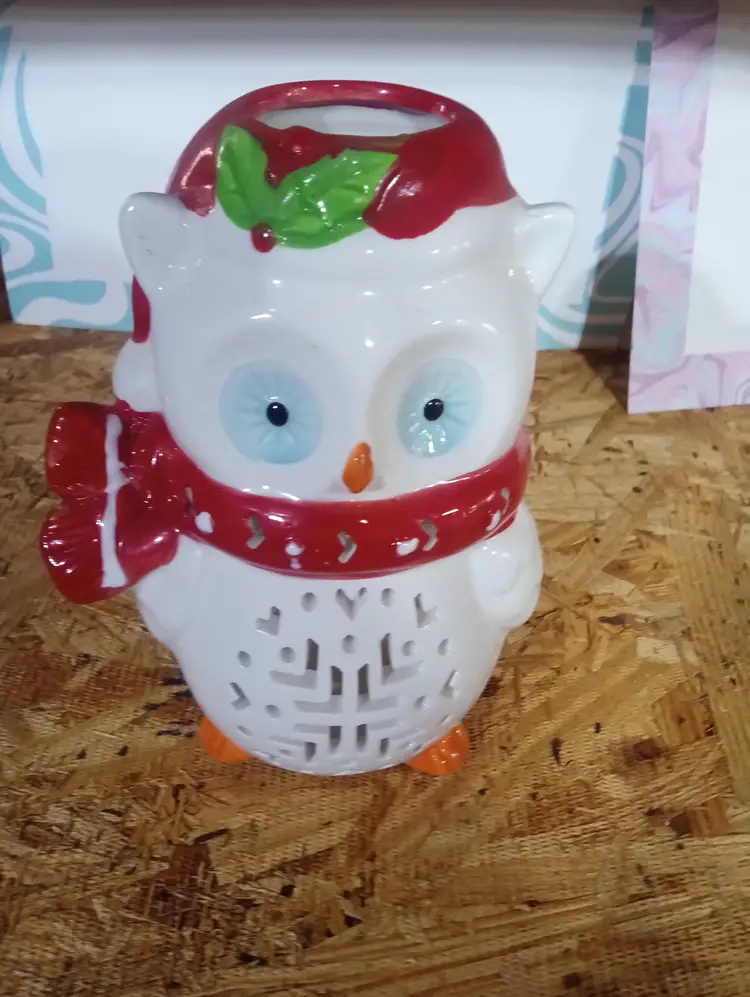 Adorable ceramic owl Christmas candle holder featuring festive red scarf, holly detail, and cutout design. Perfect for holding a tealight candle and adding a cozy holiday glow to your home. Great for Christmas décor, gifting, or winter displays.
