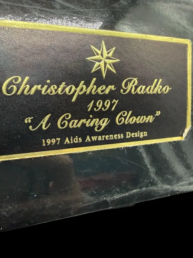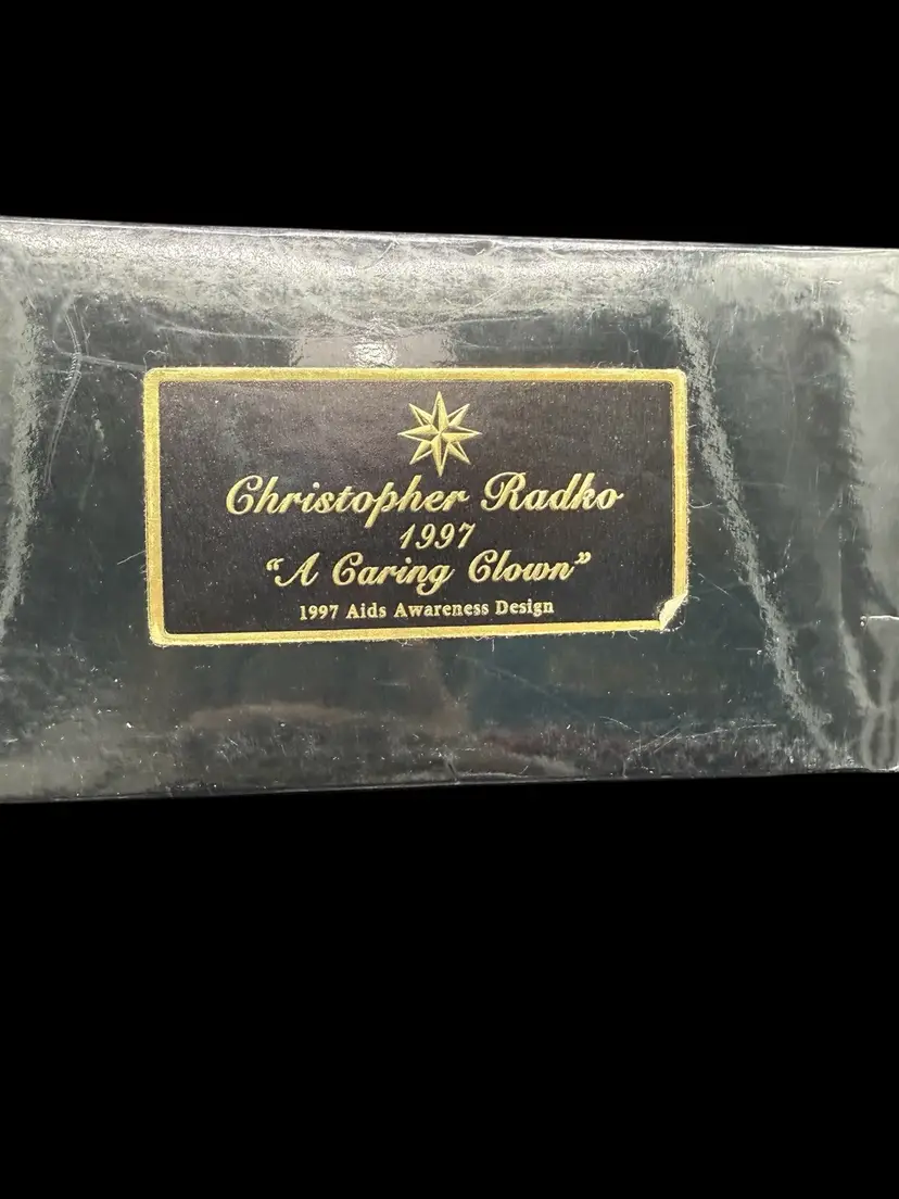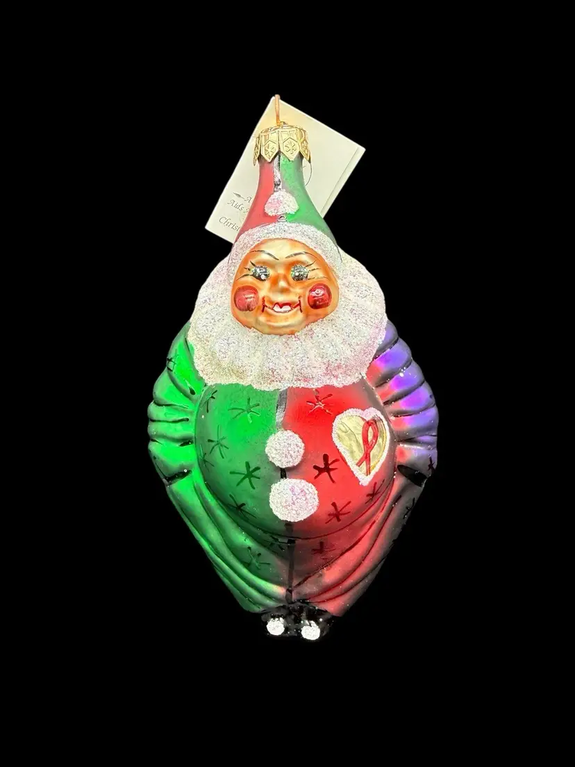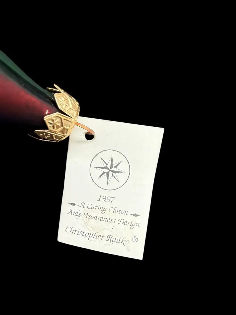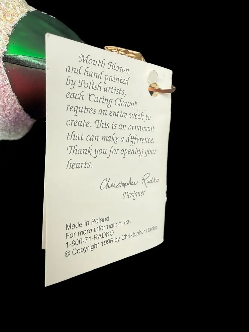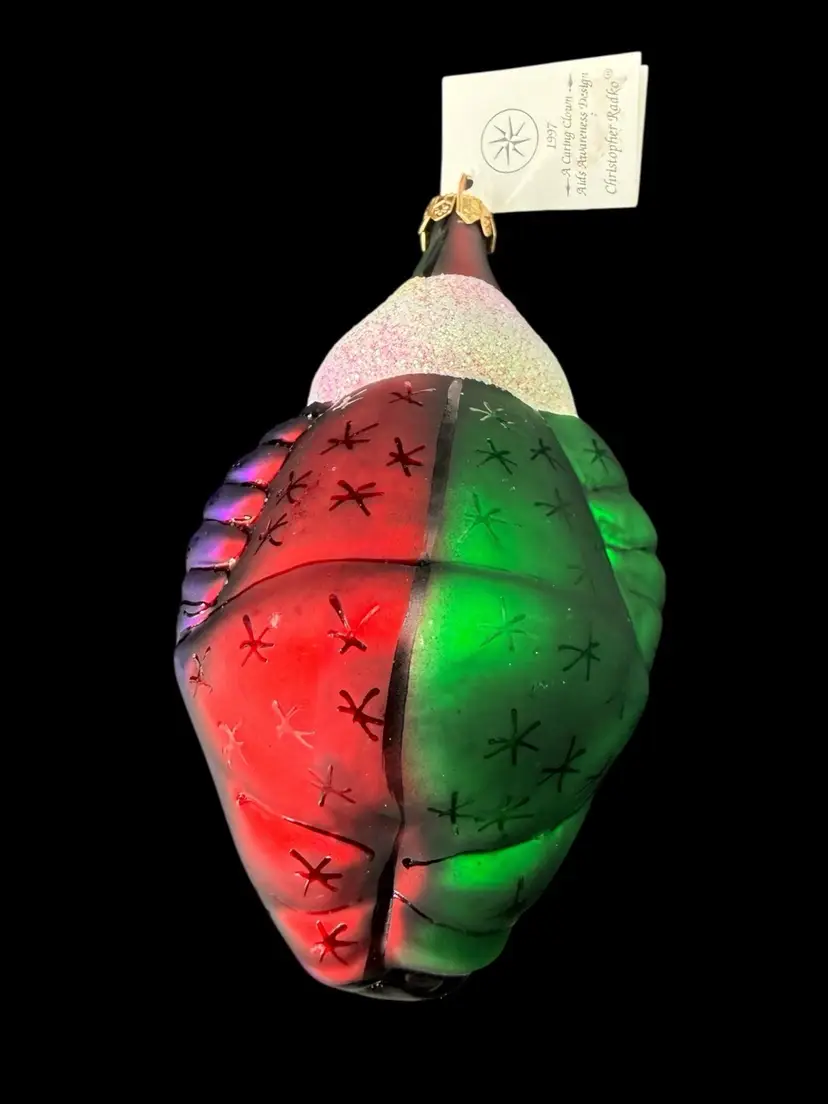 The Christopher Radko A Caring Clown 1997 Vintage Christmas Ornament is a festive and unique addition to any holiday decor collection. This ornament, designed by acclaimed artist Christopher Radko, features a colorful clown shape made of hand-blown glass. With a theme of holiday cheer and AIDS awareness, this vintage piece includes the original box and is a hanging ornament that will surely bring a smile to anyone's face during the Christmas season. Made in Poland, this artist-designed and hand-painted ornament is a special and collectible item for any ornament enthusiast.