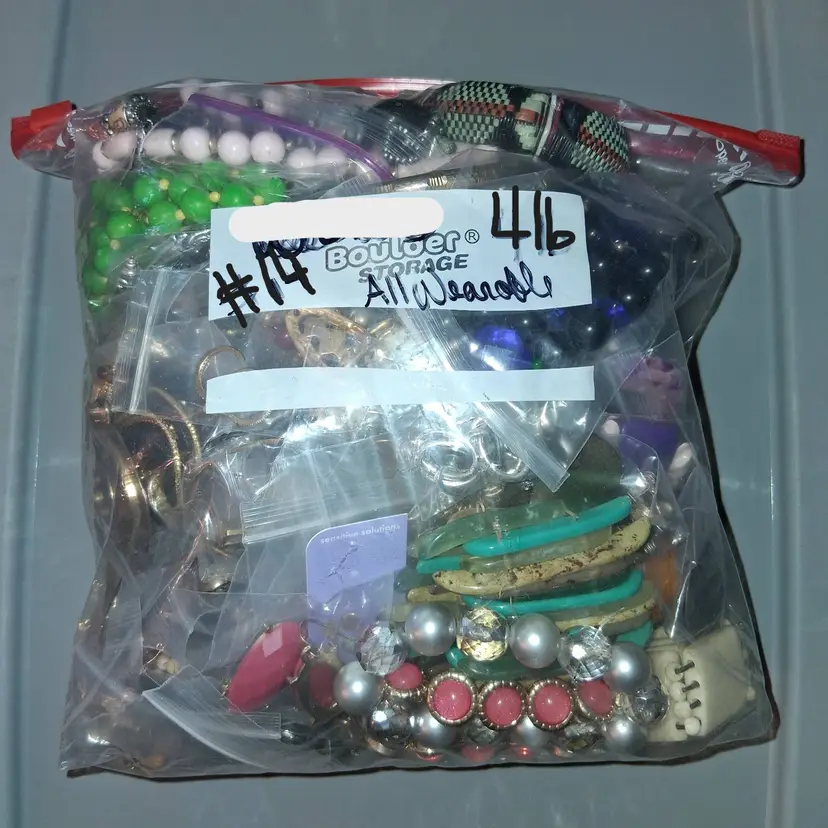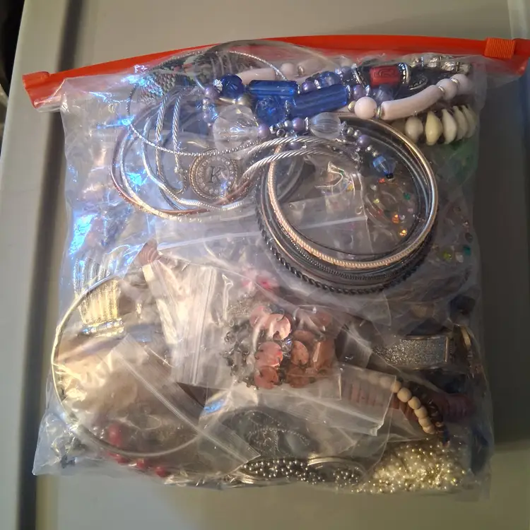 This is a 4 lb mystery bag #14, mixed lot of vintage to modern, all wearable costume jewelry, consisting of, necklaces, earrings, bracelets and even some more. Each piece or earring set, I have individually bagged in mini zip lock bags and they ready to be resold online, live auction selling, or at flea markets, etc. Some bangle-style bracelets are not bagged. The jewelry is a mix of multicolor pieces made with mixed metals and materials, including vintage pieces to modern styles. This collection offers many more than 50 pieces perfect for fashion enthusiasts looking to add unique and eclectic pieces to their collection, or for reselling. You could make your money back in about 12-15 pieces and the rest, is your profit! I cut out a big part of the work, by sorting, selecting and bagging each piece for you! All are in GREAT COND!!