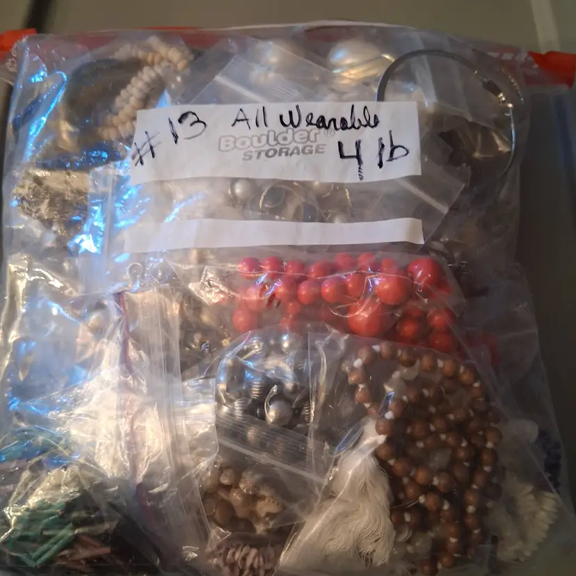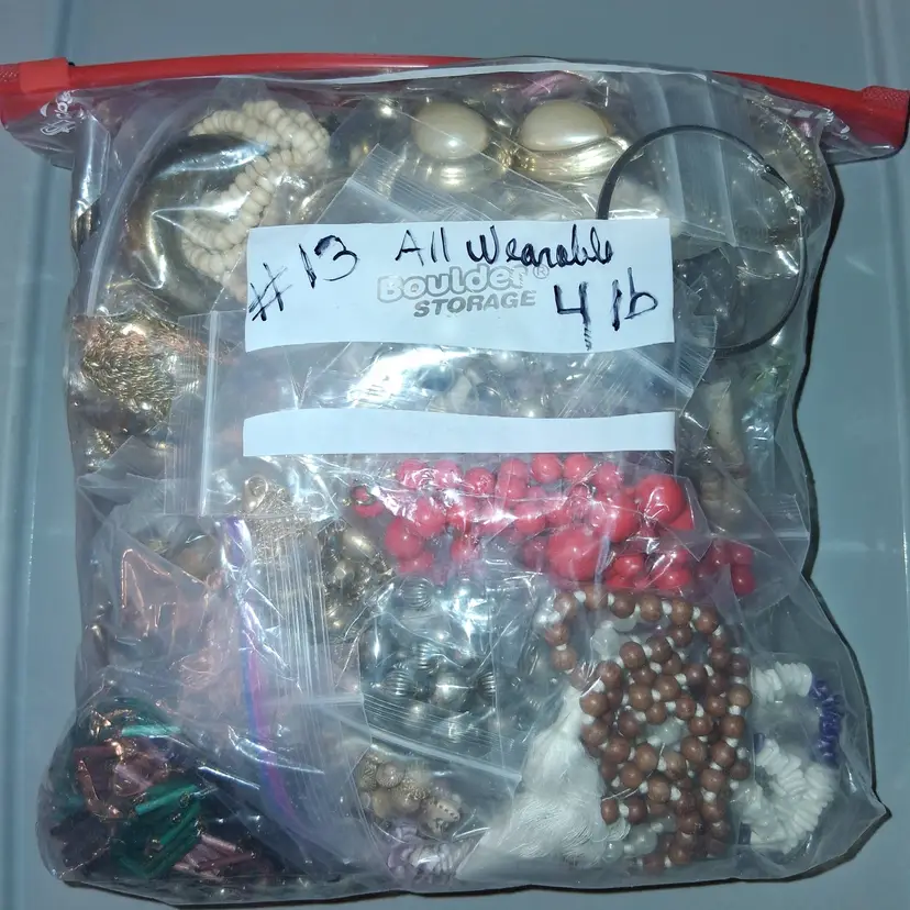 This is a 4 lb mystery bag #13, mixed lot of vintage to modern, all wearable costume jewelry, consisting of, necklaces, earrings, bracelets and even some more. Each piece or earring set, I have individually bagged in mini zip lock bags and they ready to be resold online, live auction selling, or at flea markets, etc. Some bangle-style bracelets are not bagged. The jewelry is a mix of multicolor pieces made with mixed metals and materials, including vintage pieces to modern styles. This collection offers many more than 50 pieces perfect for fashion enthusiasts looking to add unique and eclectic pieces to their collection, or for reselling. You could make your money back in about 12-15 pieces and the rest, is your profit! I cut out a big part of the work, by sorting, selecting and bagging each piece for you! All are in GREAT COND!!