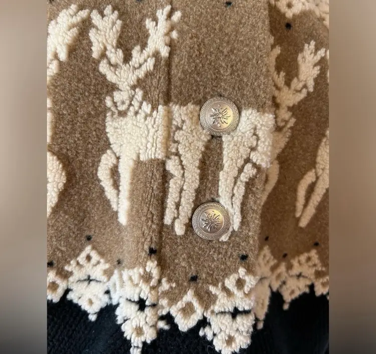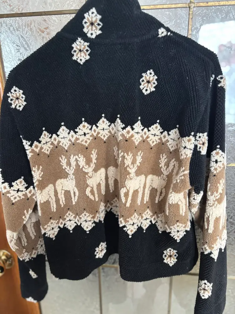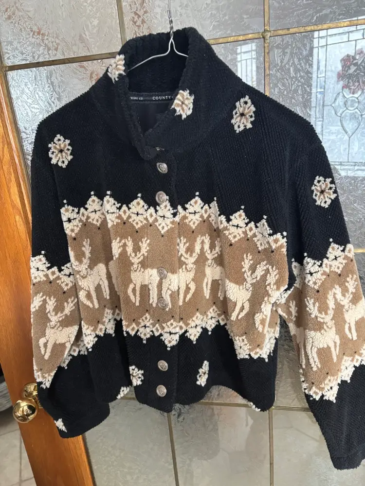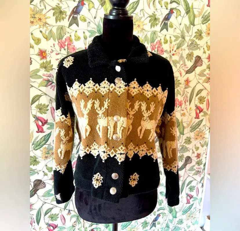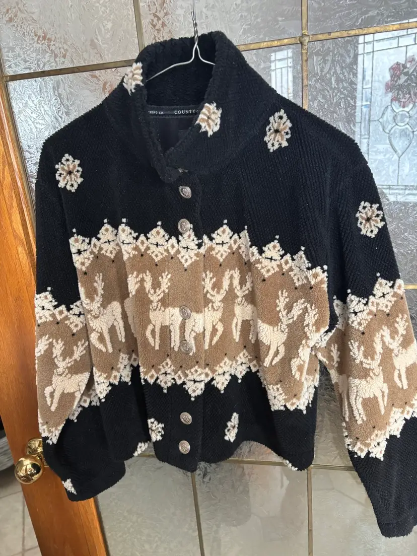 Stay cozy and stylish with this charming black and gold deer jacket. Perfect for adding a festive touch to your wardrobe. 20.5” pit to pit.