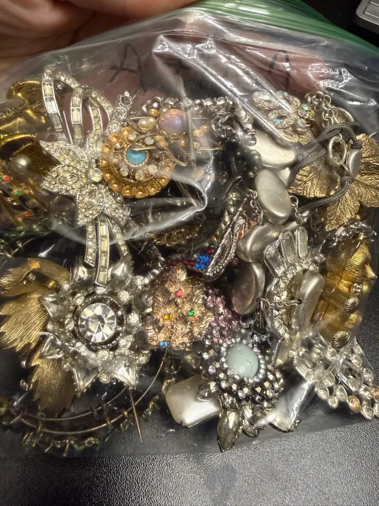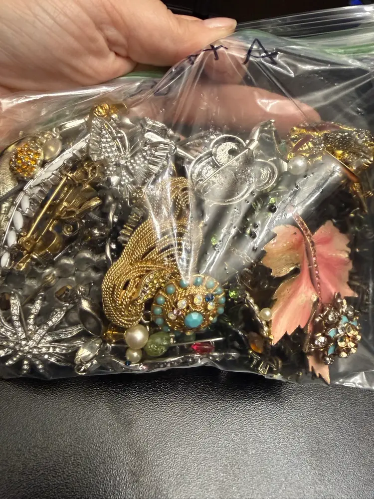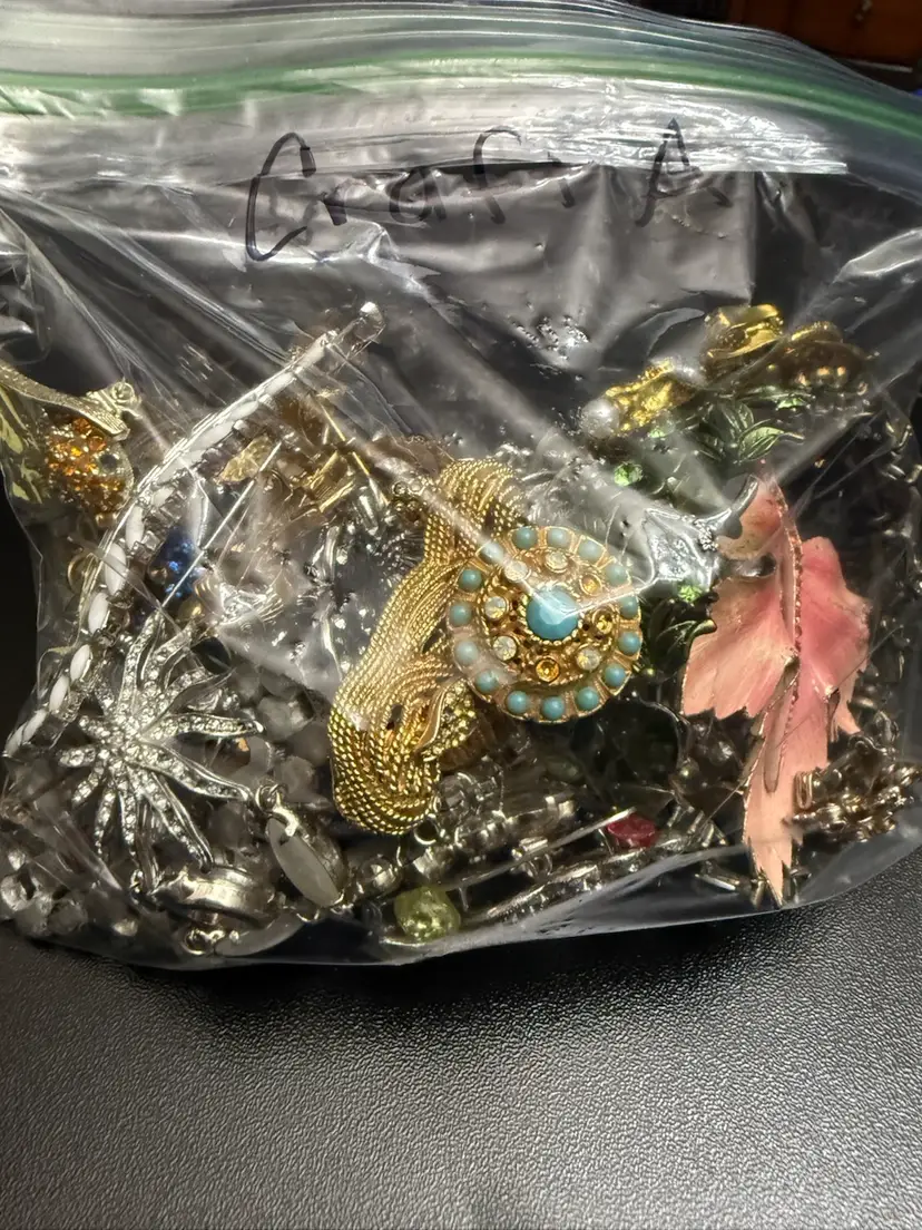 Craft bag with mostly rhinestone brooches and a few various other pieces for crafting and repurposing.