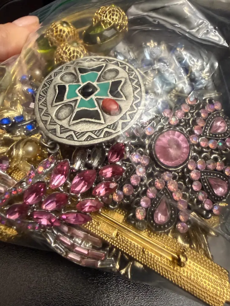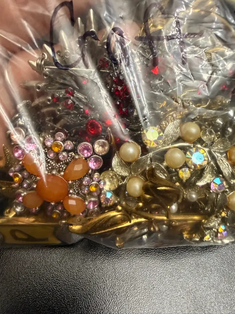 Craft bag with mostly rhinestone brooches and a few various other pieces for crafting and repurposing.