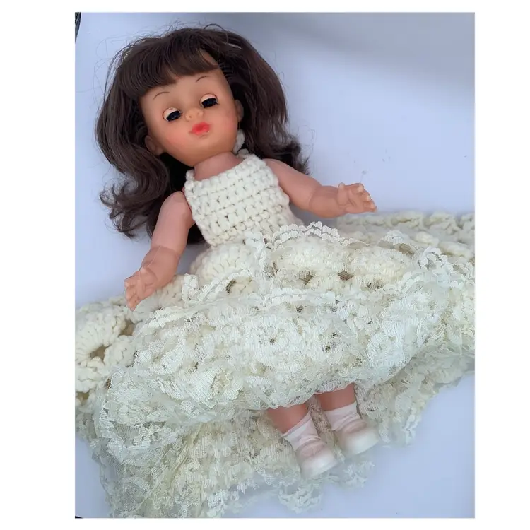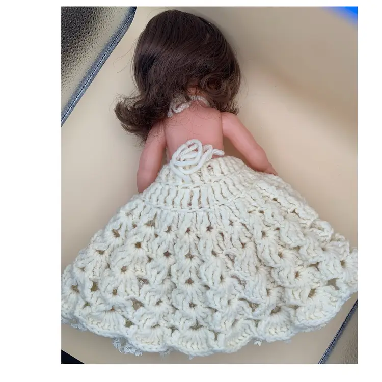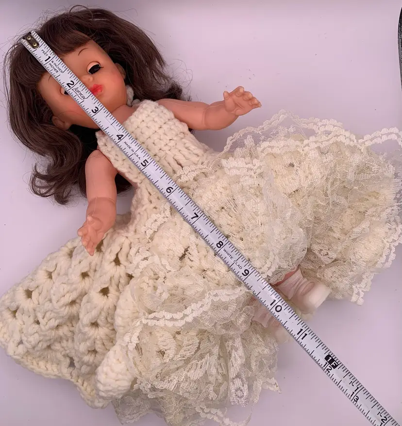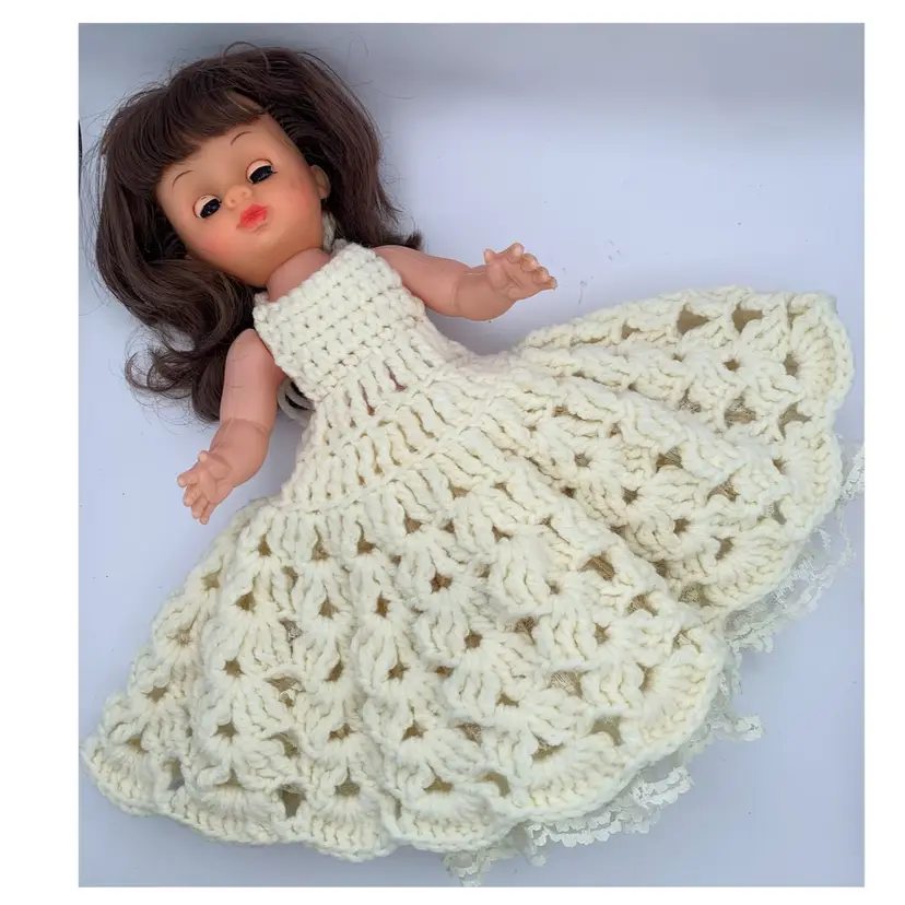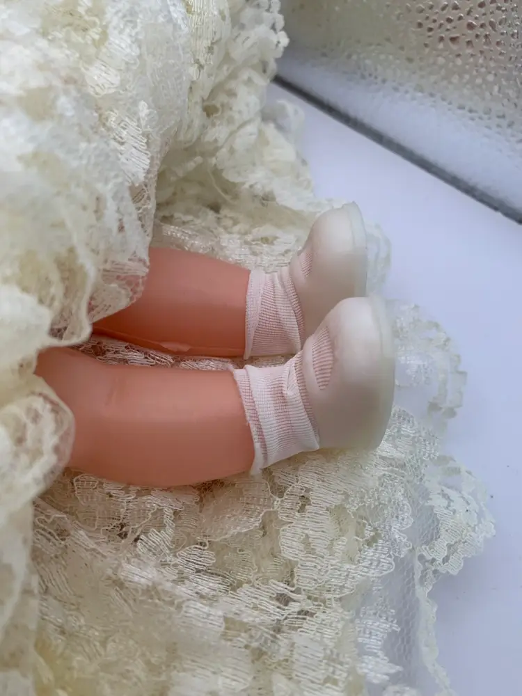 Off white with lace lining. Doll has jointed arms/legs. Closing eyes. Also has socks and shoes. Dress ties in the back.