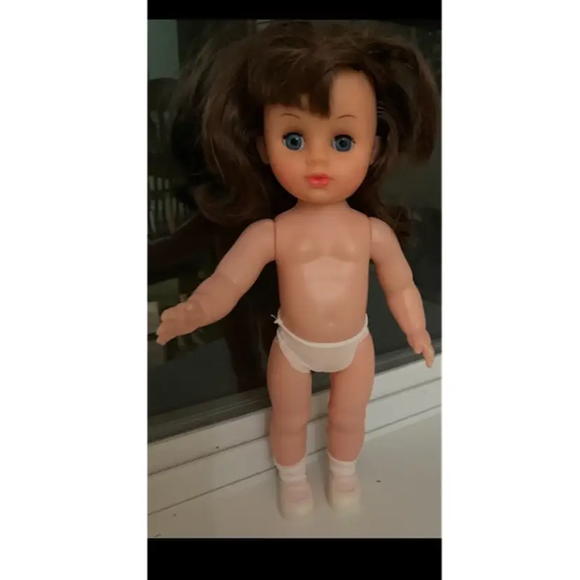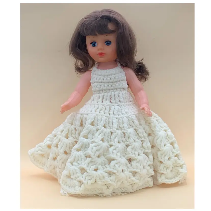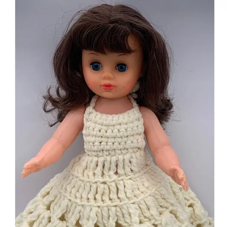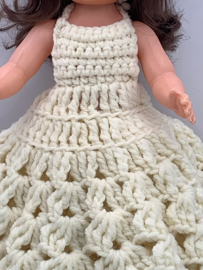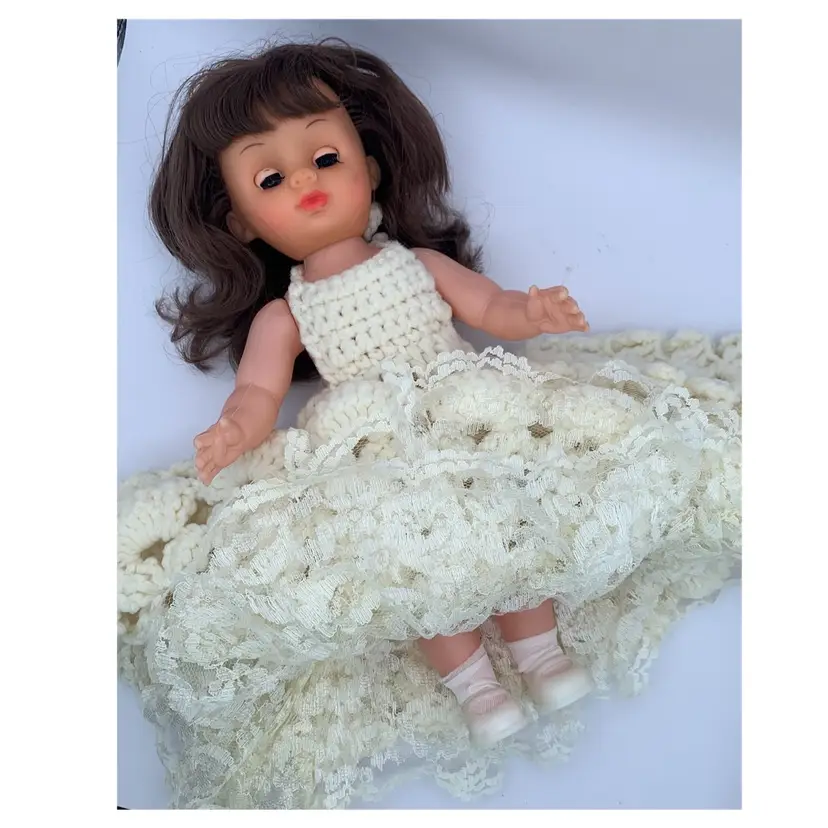 Off white with lace lining. Doll has jointed arms/legs. Closing eyes. Also has socks and shoes. Dress ties in the back.