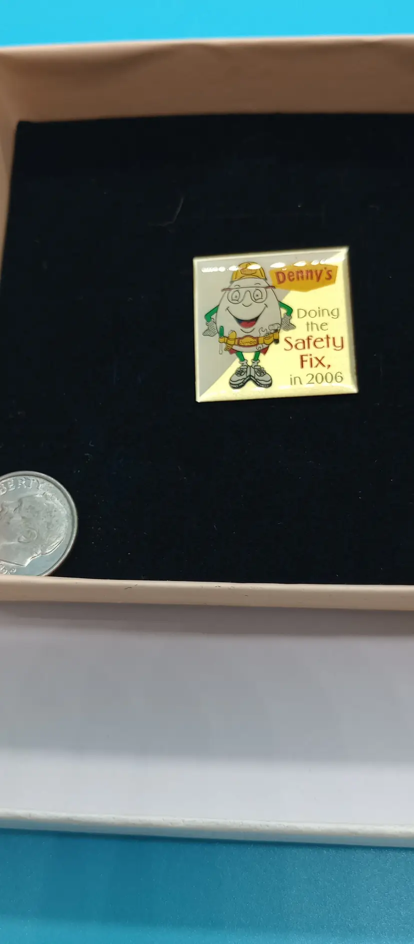 One inch square Denny's Restaurant Chain pin with tie tack backing. Item 2503203
