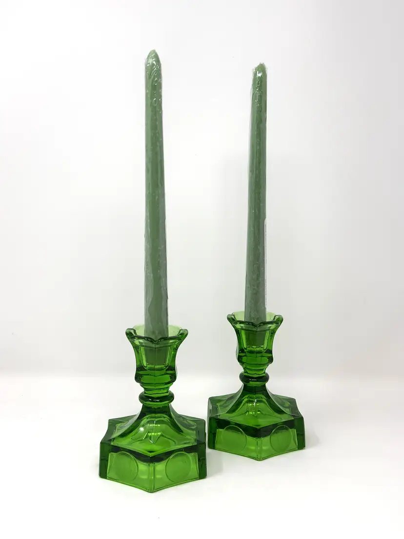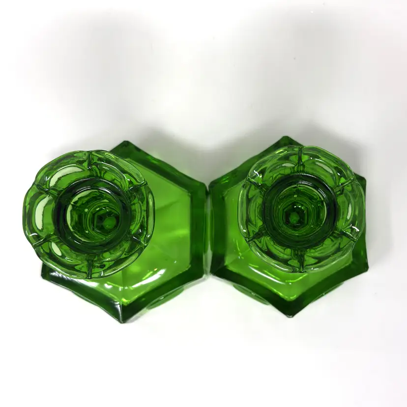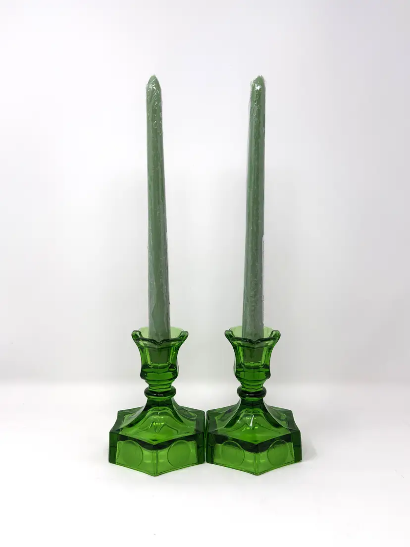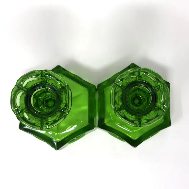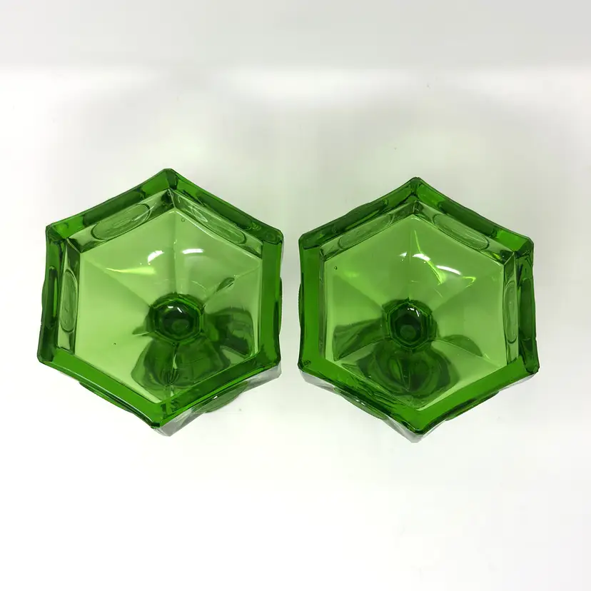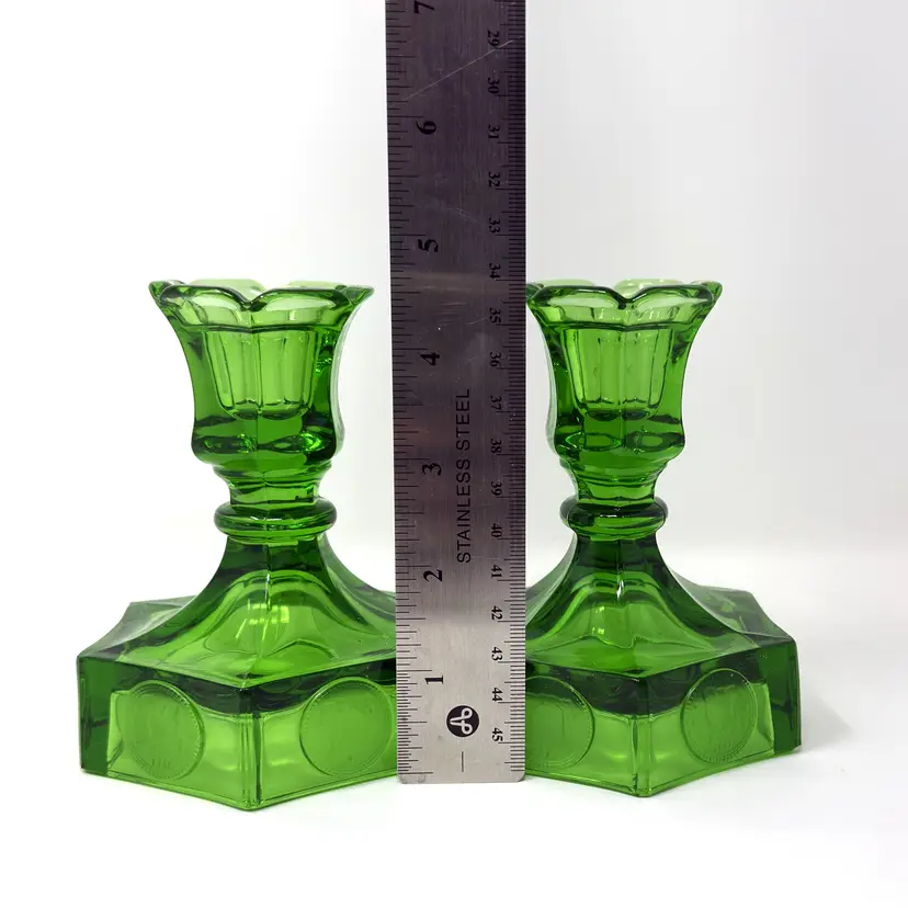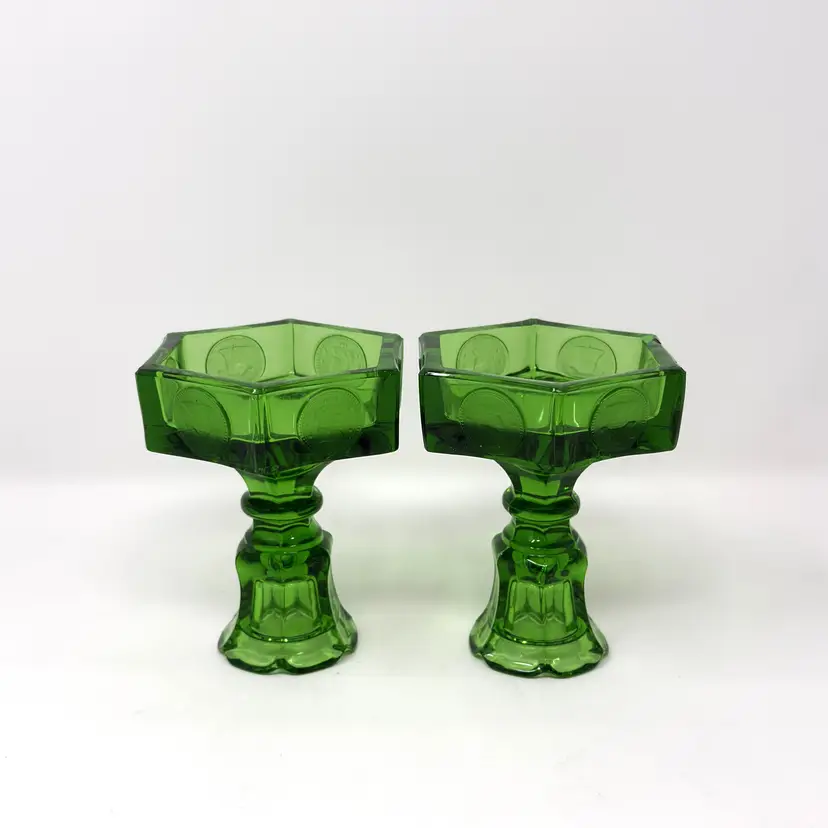 Bold color, iconic design, and timeless mid-century charm. This pair of emerald green candle holders was made by Fostoria in their classic Coin Glass pattern, first introduced in the 1960s. Featuring a crisp hexagonal base with raised coin medallions and a flared, scalloped top, they reflect Colonial Revival design through a modernist lens. Sturdy, weighty, and radiant in color, they are both collectible and usable — ideal for holiday tablescapes, shelf styling, or elegant mantle displays.