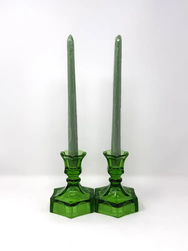 Pair of vintage emerald green candle holders by Fostoria in their classic Coin Glass pattern. Eye-catching color, elegant shape, and rich mid-century charm.